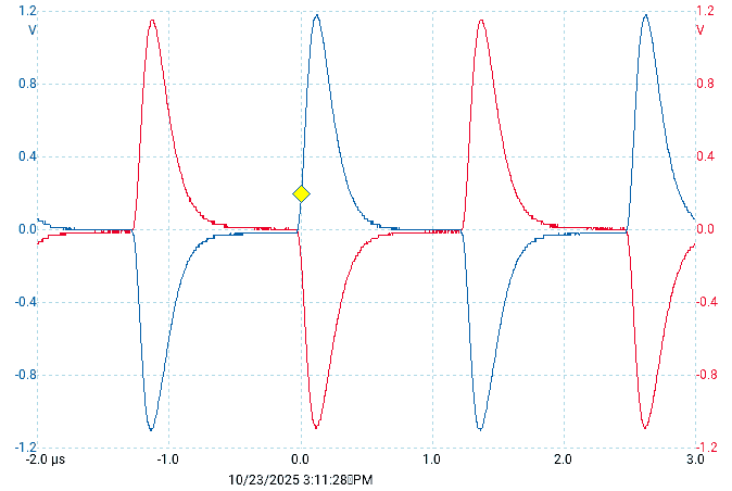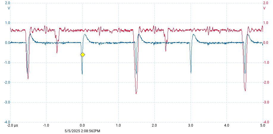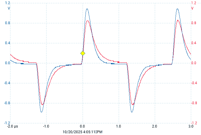 With our test rig producing clean 20mV spikes as input, the collectors of Q5 produce complementary and somewhat stretched spikes with an amplitude close to 0.25V. At first glance, it is very difficult to see any difference between the good board and the problem board. Note that the complementary outputs were recorded separately and then combined here. Small horizontal differences between the two red traces are the result of jitter in the signal generator output and not evidence of amplifier problems.