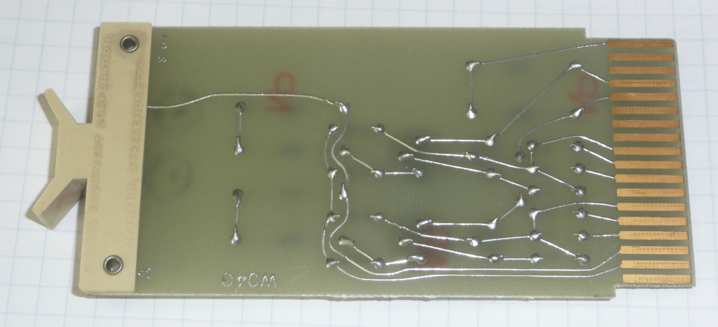 This led us to pull the R220 3-bit shift register board from backplane slot MF22. Even though we had just tested all the diodes, careful testing revealed that 3 more diodes on this board were bad. We suspect that the nearly random placement of diodes on this very crowded board led us to miss some of the bad diodes.