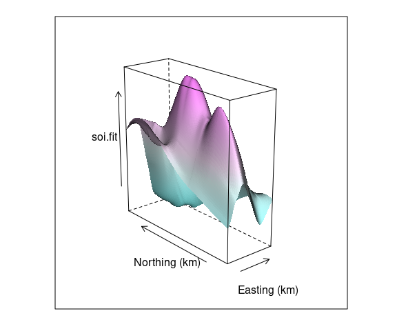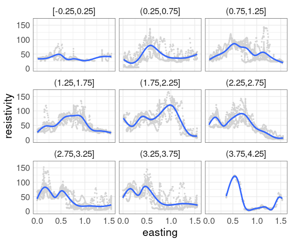 Data from Cleveland’s Visualizing Data book contains measurements of soil resistivity of an agricultural field along a roughly rectangular grid.