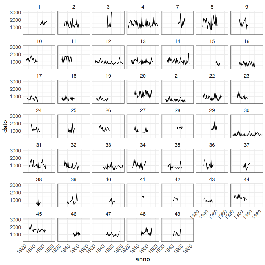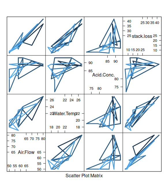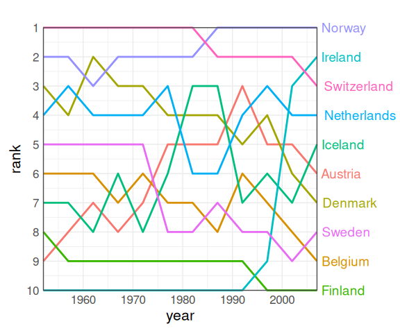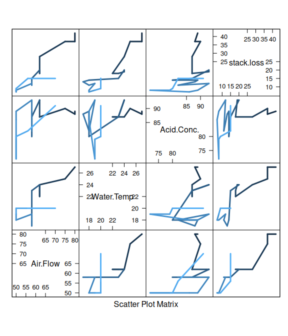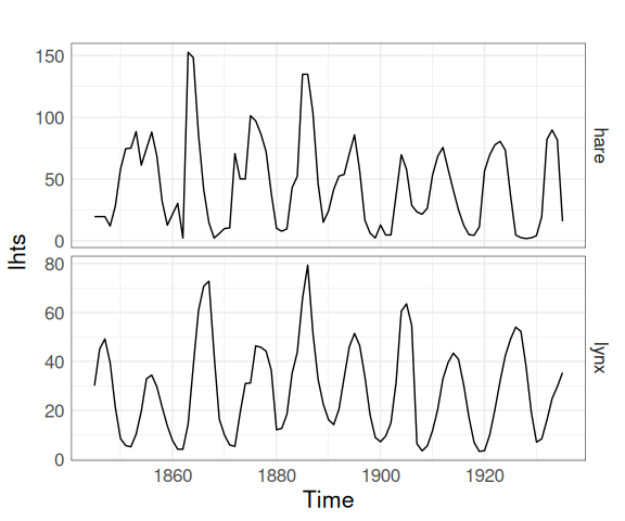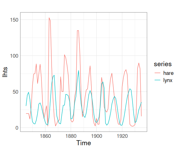 LS0tCnRpdGxlOiAiUGxvdHMgZm9yIE11bHRpcGxlIFRpbWUgU2VyaWVzIgpvdXRwdXQ6CiAgaHRtbF9kb2N1bWVudDoKICAgIHRvYzogeWVzCiAgICBjb2RlX2ZvbGRpbmc6IHNob3cKICAgIGNvZGVfZG93bmxvYWQ6IHRydWUKLS0tCgo8bGluayByZWw9InN0eWxlc2hlZXQiIGhyZWY9InN0YXQ0NTgwLmNzcyIgdHlwZT0idGV4dC9jc3MiIC8+CjxzdHlsZSB0eXBlPSJ0ZXh0L2NzcyI+IC5yZW1hcmstY29kZSB7IGZvbnQtc2l6ZTogODUlOyB9IDwvc3R5bGU+CmBgYHtyIHNldHVwLCBpbmNsdWRlID0gRkFMU0V9CnNvdXJjZShoZXJlOjpoZXJlKCJzZXR1cC5SIikpCmtuaXRyOjpvcHRzX2NodW5rJHNldChjb2xsYXBzZSA9IFRSVUUsIG1lc3NhZ2UgPSBGQUxTRSwKICAgICAgICAgICAgICAgICAgICAgIGZpZy5oZWlnaHQgPSA1LCBmaWcud2lkdGggPSA2LCBmaWcuYWxpZ24gPSAiY2VudGVyIikKCm9wdGlvbnMoaHRtbHRvb2xzLmRpci52ZXJzaW9uID0gRkFMU0UpCgpzZXQuc2VlZCgxMjM0NSkKbGlicmFyeShnZ3Bsb3QyKQpsaWJyYXJ5KGxhdHRpY2UpCmxpYnJhcnkodGlkeXZlcnNlKQpsaWJyYXJ5KGdyaWRFeHRyYSkKbGlicmFyeShmb3JlY2FzdCkKdGhlbWVfc2V0KHRoZW1lX21pbmltYWwoKSArCiAgICAgICAgICB0aGVtZSh0ZXh0ID0gZWxlbWVudF90ZXh0KHNpemUgPSAxNiksCiAgICAgICAgICAgICAgICBwYW5lbC5ib3JkZXIgPSBlbGVtZW50X3JlY3QoY29sb3IgPSAiZ3JleTMwIiwgZmlsbCA9IE5BKSkpCmBgYAoKCiMjIE11bHRpcGxlIFRpbWUgU2VyaWVzCgpTb21lIHF1ZXN0aW9ucyBmb3IgbXVsdGlwbGUgdGltZSBzZXJpZXM6CgotIEhvdyBkbyB0aGUgc2VyaWVzIGJlaGF2ZSBpbmRpdmlkdWFsbHk/CgotIEhvdyBhcmUgdGhlIHNlcmllcyByZWxhdGVkPwoKLSBEb2VzIG9uZSBzZXJpZXMgbGVhZCBvciBsYWcgdGhlIG90aGVycz8KClNvbWUgb3B0aW9ucyBmb3IgcGxvdHRpbmcgbXVsdGlwbGUgc2VyaWVzOgoKLSBzZXBhcmF0ZSBwYW5lbHMgaW4gYSB0cmVsbGlzIGRpc3BsYXk7CgotIG11bHRpcGxlIHNlcmllcyBpbiBhIHNpbmdsZSBwbG90IC0gdGhpcyB3aWxsIHJlcXVpcmUgc3RhbmRhcmRpemluZwogIGlmIHRoZSBzY2FsZXMgdmFyeSBzdWJzdGFudGlhbGx5OwoKLSBhIG11bHRpdmF0aWF0ZSBwbG90IHdpdGggdGltZSByZXByZXNlbnRlZCBieSBjb25uZWN0aW5nIGxpbmUKICBzZWdtZW50cyBvciBhbmltYXRpb24uCgpBbm90aGVyIG9wdGlvbiBmb3IgdHdvIHRpbWUgc2VyaWVzOgoKLSB1c2UgYSBzZXBhcmF0ZSBgeWAgYXhpcyBmb3IgZWFjaC4KClRoaXMgaXMgdXN1YWxseSBhIGJhZCBpZGVhLgoKU29tZSBkYXRhIHN0cnVjdHVyZXMgZm9yIG11bHRpcGxlIHRpbWUgc2VyaWVzOgoKKiBgbXRzYCBvYmplY3RzIGNyZWF0ZWQgYnkgYHRzKClgLgoKICAgIC0gQWxsIHNlcmllcyBoYXZlIHRvIGJlIG51bWVyaWMuCiAgICAtIGBhdXRvcGxvdGAgbWV0aG9kcyBtYXkgYmUgc3VmZmljaWVudC4KCiogUmVndWxhciBkYXRhIGZyYW1lcy4KCiAgICAtIFRoZSBzZXJpZXMgd2lsbCBoYXZlIHRvIGJlIHBsb3R0ZWQgaW4gc2VwYXJhdGUgbGF5ZXJzLAogICAgLSBvciB0aGUgZGF0YSBmcmFtZXMgd2lsbCBuZWVkIGNvbnZlcnRpbmcgaW50byBsb25nIGZvcm0uCgoKIyMgQ3JpbWVhbiBXYXIgQ2FzdWFsdGllcwoKVGhlIGBIaXN0RGF0YWAgcGFja2FnZSBjb250YWlucyB0aGUgZGF0YSB1c2VkIGJ5IEZsb3JlbmNlIE5pZ2h0aW5nYWxlCnRvIGNhbGwgYXR0ZW50aW9uIHRvIHRlcnJpYmxlIHNhbml0YXJ5IGNvbmRpdGlvbnMgZm9yIHRoZSBCcml0aWNoIGFybXkKaW4gQ3JpbWVhLgoKYGBge3J9CmRhdGEoTmlnaHRpbmdhbGUsIHBhY2thZ2UgPSAiSGlzdERhdGEiKQpoZWFkKHNlbGVjdChOaWdodGluZ2FsZSwgLURhdGUpKQpgYGAKCkEgcGxvdCBvZiB0aGUgYERpc2Vhc2VgLCBgV291bmRzYCwgYW5kIGBPdGhlcmA6CgpgYGB7ciBuaWdodC10cy1hdXRvLCBlY2hvID0gRkFMU0UsIGZpZy53aWR0aCA9IDcuNX0KbkRXTyA8LSBzZWxlY3QoTmlnaHRpbmdhbGUsCiAgICAgICAgICAgICAgIERpc2Vhc2UsIFdvdW5kcywgT3RoZXIpIHw+CiAgICB0cyhzdGFydCA9IGMoMTg1NCwgNCksIGZyZXF1ZW5jeSA9IDEyKQoKYXV0b3Bsb3QobkRXTykKYGBgCmBgYHtyIG5pZ2h0LXRzLWF1dG8sIGV2YWwgPSBGQUxTRX0KYGBgCgpVc2luZyB0aGUgcmF0ZSB2YXJpYWJsZXMgcHJvZHVjZXMgYSB2ZXJ5IHNpbWlsYXIgcGF0dGVybjoKCmBgYHtyIG5pZ2h0LXJhdGUtdHMtYXV0bywgZWNobyA9IEZBTFNFLCBmaWcud2lkdGggPSA3LjV9Cm5EV08ucmF0ZSA8LSBzZWxlY3QoTmlnaHRpbmdhbGUsCiAgICAgICAgICAgICAgICAgICAgZW5kc193aXRoKCJyYXRlIikpIHw+CiAgICB0cyhzdGFydCA9IGMoMTg1NCwgNCksIGZyZXF1ZW5jeSA9IDEyKQoKYXV0b3Bsb3QobkRXTy5yYXRlKQpgYGAKYGBge3IgbmlnaHQtcmF0ZS10cy1hdXRvLCBldmFsID0gRkFMU0V9CmBgYAoKVGhlIGFybXkgc2l6ZSBkb2VzIG5vdCB2YXJ5IGVub3VnaCBvdmVyIHRoZSB0aW1lIHdoZXJlIHRoZSBjYXN1YWx0aWVzCmFyZSBoaWdoIHRvIGFmZmVjdCB0aGUgcGF0dGVybiBtdWNoOgoKYGBge3IgbmlnaHQtYXJteS10cy1hdXRvLCBlY2hvID0gRkFMU0V9Cm5Bcm15IDwtIHNlbGVjdChOaWdodGluZ2FsZSwgQXJteSkgfD4KICAgIHRzKHN0YXJ0ID0gYygxODU0LCA0KSwgZnJlcXVlbmN5ID0gMTIpCgphdXRvcGxvdChuQXJteSkKYGBgCmBgYHtyIG5pZ2h0LWFybXktdHMtYXV0bywgZXZhbCA9IEZBTFNFfQpgYGAKCkluc3RlYWQgb2Ygc2hvd2luZyB0aHJlZSBzZXJpZXMgaW4gb25lIHBsb3QgeW91IGNhbiBhbHNvIHVzZSBmYWNldGluZy4KCmBgYHtyIG5pZ2h0LWF1dG8tZmFjZXQsIGVjaG8gPSBGQUxTRX0KYXV0b3Bsb3QobkRXTywgZmFjZXRzID0gVFJVRSkKYGBgCmBgYHtyIG5pZ2h0LWF1dG8tZmFjZXQsIGV2YWwgPSBGQUxTRX0KYGBgCgpUbyBjcmVhdGUgdGhlIHBsb3Qgb2YgYERpc2Vhc2VgLCBgV291bmRzYCwgYW5kIGBPdGhlcmAgdXNpbmcgYmFzaWMKYGdncGxvdGAgaXQgaXMgYmVzdCB0byBmaXJzdCBjb252ZXJ0IHRoZSBkYXRhIGludG8gbG9uZyBmb3JtLgoKWW91IGNhbiBjcmVhdGUgYSBsb25nIHZlcnNpb24gb2YgdGhlIGRhdGEsIHVzaW5nIGVpdGhlciBgcGl2b3RfbG9uZ2VyYApvciBgYnJvb206OnRpZHlgLgoKVXNpbmcgYGJyb29tOnRpZHlgIG9uIHRoZSBgbXRzYCBvYmplY3Q6CgpgYGB7ciBuaWdodC1nZ3Bsb3QtYnJvb20sIGVjaG8gPSBGQUxTRSwgZmlnLndpZHRoID0gNy41fQpicm9vbTo6dGlkeShuRFdPKSB8PgogICAgcmVuYW1lKERhdGUgPSBpbmRleCwKICAgICAgICAgICBEZWF0aHMgPSB2YWx1ZSwKICAgICAgICAgICBDYXVzZSA9IHNlcmllcykgfD4KICAgIGdncGxvdChhZXMoeCA9IERhdGUsCiAgICAgICAgICAgICAgIHkgPSBEZWF0aHMsCiAgICAgICAgICAgICAgIGNvbG9yID0gQ2F1c2UpKSArCiAgICBnZW9tX2xpbmUoKQpgYGAKYGBge3IgbmlnaHQtZ2dwbG90LWJyb29tLCBldmFsID0gRkFMU0V9CmBgYAoKVXNpbmcgYHBpdm90X2xvbmdlcmAgb24gdGhlIG9yaWdpbmFsIGRhdGEgZnJhbWU6CgpgYGB7ciBuaWdodC1nZ3Bsb3QtcGl2b3QtbG9uZ2VyLCBlY2hvID0gRkFMU0UsIGZpZy53aWR0aCA9IDcuNX0Kc2VsZWN0KE5pZ2h0aW5nYWxlLAogICAgICAgRGF0ZSwgRGlzZWFzZSwgV291bmRzLCBPdGhlcikgfD4KICAgIHBpdm90X2xvbmdlcigtRGF0ZSwKICAgICAgICAgICAgICAgICBuYW1lc190byA9ICJDYXVzZSIsCiAgICAgICAgICAgICAgICAgdmFsdWVzX3RvID0gIkRlYXRocyIpIHw+CiAgICBnZ3Bsb3QoYWVzKHggPSBEYXRlLAogICAgICAgICAgICAgICB5ID0gRGVhdGhzLAogICAgICAgICAgICAgICBjb2xvciA9IENhdXNlKSkgKwogICAgZ2VvbV9saW5lKCkKYGBgCmBgYHtyIG5pZ2h0LWdncGxvdC1waXZvdC1sb25nZXIsIGV2YWwgPSBGQUxTRX0KYGBgCgpVc2luZyBmYWNldGluZyBpbnN0ZWFkIG9mIGEgc2luZ2xlIHBsb3Q6CgpgYGB7ciBuaWdodC1nZ3Bsb3QtZmFjZXQsIGVjaG8gPSBGQUxTRX0Kc2VsZWN0KE5pZ2h0aW5nYWxlLAogICAgICAgRGF0ZSwgRGlzZWFzZSwgV291bmRzLCBPdGhlcikgfD4KICAgIHBpdm90X2xvbmdlcigtRGF0ZSwKICAgICAgICAgICAgICAgICBuYW1lc190byA9ICJDYXVzZSIsCiAgICAgICAgICAgICAgICAgdmFsdWVzX3RvID0gIkRlYXRocyIpIHw+CiAgICBnZ3Bsb3QoYWVzKHggPSBEYXRlLCB5ID0gRGVhdGhzKSkgKwogICAgZ2VvbV9saW5lKCkgKwogICAgZmFjZXRfd3JhcCh+IENhdXNlLCBuY29sID0gMSkKYGBgCmBgYHtyIG5pZ2h0LWdncGxvdC1mYWNldCwgZXZhbCA9IEZBTFNFfQpgYGAKClRvIGZvY3VzIG9uIHRoZSBzaGFwZSBvZiB0aGUgY3VydmVzIGl0IGlzIG9mdGVuIHVzZWZ1bCB0byBhbGxvdyB0aGUKdmVydGljYWwgYXhpcyByYW5nZXMgdG8gYWRqdXN0IHRvIHRoZSBkYXRhOgoKYGBge3IgbmlnaHQtZ2dwbG90LWZhY2V0LWZyZWUteSwg