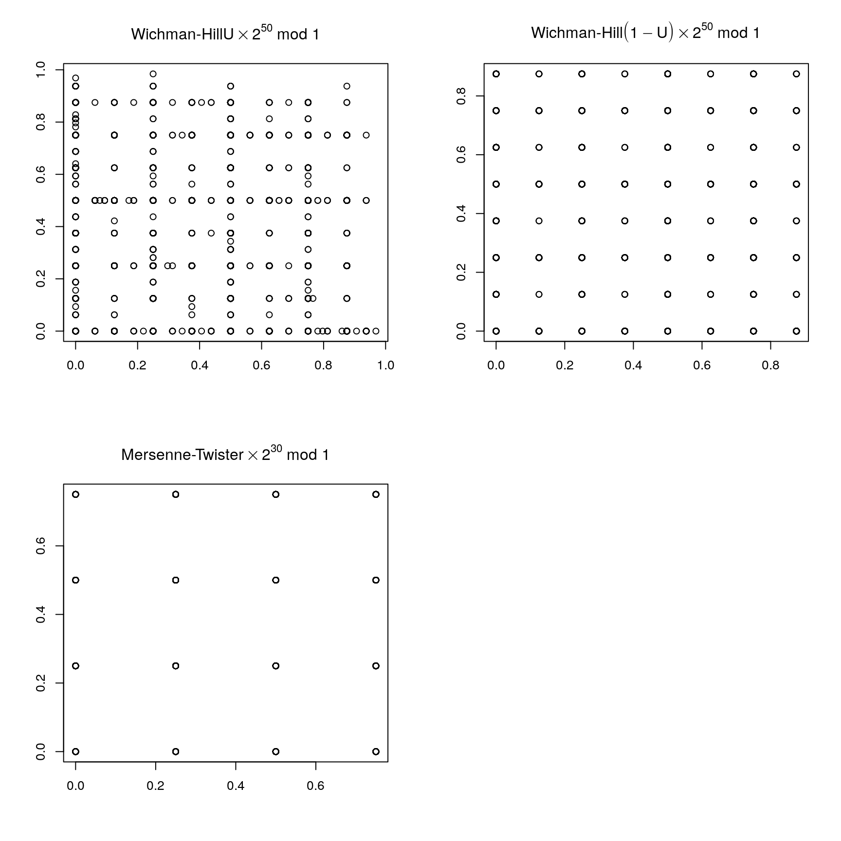 \[\begin{equation*} x_i = (a x_{i-1} +c) \mod M \end{equation*}\]with \(0 \le x_i < M\).