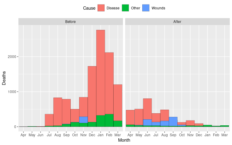 LS0tCnRpdGxlOiAiVmlzdWFsaXppbmcgQW1vdW50cyIKb3V0cHV0OgogIGh0bWxfZG9jdW1lbnQ6CiAgICB0b2M6IHllcwogICAgY29kZV9mb2xkaW5nOiAiaGlkZSIKICAgIGNvZGVfZG93bmxvYWQ6IHRydWUKLS0tCgo8bGluayByZWw9InN0eWxlc2hlZXQiIGhyZWY9InN0YXQ0NTgwLmNzcyIgdHlwZT0idGV4dC9jc3MiIC8+CjwhLS0gdGl0bGUgYmFzZWQgb24gV2lsa2UncyBjaGFwdGVyIC0tPgoKYGBge3Igc2V0dXAsIGluY2x1ZGUgPSBGQUxTRX0Kc291cmNlKGhlcmU6OmhlcmUoInNldHVwLlIiKSkKa25pdHI6Om9wdHNfY2h1bmskc2V0KGNvbGxhcHNlID0gVFJVRSwgbWVzc2FnZSA9IEZBTFNFLAogICAgICAgICAgICAgICAgICAgICAgZmlnLmhlaWdodCA9IDUsIGZpZy53aWR0aCA9IDYsIGZpZy5hbGlnbiA9ICJjZW50ZXIiKQoKbGlicmFyeShsYXR0aWNlKQpsaWJyYXJ5KHRpZHl2ZXJzZSkKbGlicmFyeShncmlkRXh0cmEpCmxpYnJhcnkoc2NhbGVzKQpzZXQuc2VlZCgxMjM0NSkKYGBgCgpgYGB7ciwgaW5jbHVkZSA9IEZBTFNFfQpzb3VyY2UoaGVyZTo6aGVyZSgiZGF0YXNldHMuUiIpKQpgYGAKCgojIyBWaXN1YWxpemF0aW9uIGFuZCBDb21wYXJpc29uCgpBIHZpc3VhbGl6YXRpb24gb2YgYSBzaW5nbGUgdmFsdWUgd2l0aG91dCBzb21lIGNvbXBhcmF0aXZlIGNvbnRleHQgaXMKcmFyZWx5IHVzZWZ1bAoKYGBge3IsIGVjaG8gPSBGQUxTRX0KbGlicmFyeShnZ3Bsb3QyKQpsaWJyYXJ5KHNjYWxlcykKZ2dwbG90KCkgKwogICAgZ2VvbV9wb2ludChhZXMoeCA9IDAsIHkgPSAwKSwKICAgICAgICAgICAgICAgc2hhcGUgPSAyMSwgc2l6ZSA9IDE1MCwgZmlsbCA9IG11dGVkKCJibHVlIikpICsKICAgIGdlb21fdGV4dChhZXMoeCA9IDAsIHkgPSAwLCBsYWJlbCA9IDIwMCksIHNpemUgPSA1MCwgY29sb3IgPSAid2hpdGUiKSArCiAgICB0aGVtZV92b2lkKCkKYGBgCgpVc2VmdWwgdmlzdWFsaXphdGlvbnMgYWxtb3N0IGFsd2F5cyBpbnZvbHZlIGNvbXBhcmlzb25zLgoKKiBwb3NpdGlvbiBvZiBhIHZhbHVlIG9uIGFuIGF4aXMKCiogcmVsYXRpdmUgcG9zaXRpb24gb2YgdHdvIHZhbHVlcwoKKiByZWxhdGl2ZSBtYWduaXR1ZGVzIG9mIHR3byB2YWx1ZXMKCkEgc2ltcGxlIGFuZCBjb21tb24gc2V0dGluZzogVmlzdWFsaXppbmcgYSBtZWFzdXJlbWVudCBvciBzdW1tYXJ5IGZvcgplYWNoIG9mIGEgc2V0IG9mIGNhdGVnb3JpZXMuCgpTb21lIG9mIHRoZSBtb3JlIGNvbW1vbiB2aXN1YWxpemF0aW9uczoKCiogRG90IENoYXJ0cyAoYWxzbyBjYWxsZWQgQ2xldmVsYW5kIERvdCBDaGFydHMpCgoqIEJhciBDaGFydHMKICAqIEdyb3VwZWQgQmFyIENoYXJ0cyAoQ2x1c3RlcmVkIEJhciBDaGFydHMpCiAgKiBTdGFja2VkIEJhciBDaGFydHMKICAqIERpdmVyZ2luZyBCYXIgQ2hhcnRzCgoqIEhlYXQgTWFwcwoKKiBCdWJibGUgQ2hhcnRzCgpTb21lIGxlc3MgZnJlcXVlbnRseSB1c2VkIHZpc3VhbGl6YXRpb25zOgoKKiBXYXRlcmZhbGwgQ2hhcnRzCiogUG9sYXIgQXJlYSBDaGFydHMgKENveGNvbWIgQ2hhcnRzKQoqIER1bWJiZWxsIENoYXJ0cwoKU29tZSBxdWVzdGlvbnMgdG8ga2VlcCBpbiBtaW5kOgoKKiBXaGF0IGNvbXBhcmlzb25zIGFuZCBvdGhlciBhc3Nlc3NtZW50cyBkbyB0aGVzZSB2aXN1YWxpemF0aW9ucyBzdXBwb3J0PwoKKiBIb3cgZG8gdGhlc2UgdmlzdWFsaXphdGlvbnMgc2NhbGUgdG8gbGFyZ2VyIGRhdGEgc2V0cz8KCgojIyBEb3QgUGxvdHMKCgojIyMgQmFzaWNzCgpPbmUgb2YgdGhlIHNpbXBsZXN0IHZpc3VhbGl6YXRpb25zIG9mIGEgc2luZ2xlIG51bWVyaWNhbCB2YXJpYWJsZSB3aXRoCmEgbW9kZXN0IG51bWJlciBvZiBvYnNlcnZhdGlvbnMgYW5kIGxhYmVscyBmb3IgdGhlIG9ic2VydmF0aW9ucyBpcyBhCl9kb3QgcGxvdF8sIG9yIF9DbGV2ZWxhbmQgZG90IHBsb3RfOgoKYGBge3IsIG1lc3NhZ2UgPSBGQUxTRSwgY2xhc3Muc291cmNlID0gImZvbGQtaGlkZSJ9CmxpYnJhcnkoZHBseXIpCmxpYnJhcnkoZ2dwbG90MikKbGlicmFyeShnYXBtaW5kZXIpCmxlX2FtXzIwMDcgPC0gZmlsdGVyKGdhcG1pbmRlciwKICAgICAgICAgICAgICAgICAgICAgeWVhciA9PSAyMDA3LAogICAgICAgICAgICAgICAgICAgICBjb250aW5lbnQgPT0gIkFtZXJpY2FzIikKdGhtIDwtIHRoZW1lX21pbmltYWwoKSArCiAgICB0aGVtZSh0ZXh0ID0gZWxlbWVudF90ZXh0KHNpemUgPSAxNikpCmdncGxvdChsZV9hbV8yMDA3LAogICAgICAgYWVzKHkgPSBjb3VudHJ5LCB4ID0gbGlmZUV4cCkpICsKICAgIGdlb21fcG9pbnQoY29sb3IgPSAiZGVlcHNreWJsdWUzIiwKICAgICAgICAgICAgICAgc2l6ZSA9IDIpICsKICAgIGxhYnMoeCA9ICJMaWZlIEV4cGVjdGFuY3kgKHllYXJzKSIsCiAgICAgICAgIHkgPSBOVUxMKSArCiAgICB0aG0KYGBgCmBgYHtyLCBlY2hvID0gRkFMU0UsIGV2YWwgPSBGQUxTRX0KIyMgdG8gb3JkZXIgYWxwaGFiZXRpY2FsbHkgZnJvbSB0b3AgdG8gYm90dG9tOgpsZV9hbV8yMDA3IDwtIG11dGF0ZShsZV9hbV8yMDA3LAogICAgICAgICAgICAgICAgICAgICBjb3VudHJ5ID0gZmFjdG9yKGNvdW50cnksIHJldihzb3J0KHVuaXF1ZShjb3VudHJ5KSwKICAgICAgICAgICAgICAgICAgICAgICAgICAgICAgICAgICAgICAgICAgICAgICAgICAgICAgICBkZXNjZW5kaW5nID0gVFJVKSkpKQpgYGAKClRoaXMgdmlzdWFsaXphdGlvbgoKKiBzaG93cyB0aGUgb3ZlcmFsbCBkaXN0cmlidXRpb24gb2YgdGhlIGRhdGEsIGFuZAoKKiBtYWtlcyBpdCBlYXN5IHRvIGxvY2F0ZSB0aGUgbGlmZSBleHBlY3RhbmN5IG9mIGEgcGFydGljdWxhciBjb3VudHJ5LgoKVW5sZXNzIHRoZXJlIGlzIGEgbmF0dXJhbCBvcmRlciB0byB0aGUgY2F0ZWdvcmllcyAoZS5nLiBtb250aHMgb2YgdGhlCnllYXIgb3IgZGF5cyBvZiB0aGUgd2VlaykgaXQgaXMgdXN1YWxseSBiZXR0ZXIgdG8gcmVvcmRlciB0byBtYWtlIHRoZQpwbG90IGluY3JlYXNpbmcgb3IgZGVjcmVhc2luZzoKCmBgYHtyLCBjbGFzcy5zb3VyY2UgPSAiZm9sZC1oaWRlIn0KZ2dwbG90KGxlX2FtXzIwMDcsCiAgICAgICBhZXMoeSA9IHJlb3JkZXIoY291bnRyeSwgbGlmZUV4cCksCiAgICAgICAgICAgeCA9IGxpZmVFeHApKSArCiAgICBnZW9tX3BvaW50KGNvbG9yID0gImRlZXBza3libHVlMyIsCiAgICAgICAgICAgICAgIHNpemUgPSAyKSArCiAgICBsYWJzKHggPSAiTGlmZSBFeHBlY3RhbmN5ICh5ZWFycykiLAogICAgICAgICB5ID0gTlVMTCkgKwogICAgdGhtCmBgYAoKKiBMb2NhdGluZyBhIHBhcnRpY3VsYXIgY291bnRyeSBpcyBhIGxpdHRsZSBtb3JlIGRpZmZpY3VsdC4KCiogQnV0IHRoZSBzaGFwZSBvZiB0aGUgZGlzdHJpYnV0aW9uIGlzIG1vcmUgYXBwYXJlbnQuCgoqIEFwcHJveGltYXRlIG1lZGlhbiBhbmQgcXVhcnRpbGVzIGNhbiBiZSByZWFkIG9mZiBlYXNpbHkuCgpEb3QgcGxvdHMgYXJlIHBhcnRpY3VsYXJseSBhcHByb3ByaWF0ZSBmb3IgaW50ZXJ2YWwgZGF0YS4KCiogdGhleSBvZnRlbiBkbyBub3Qgc2hvdyB0aGUgb3JpZ2luOwoKKiB0aGV5IGZvY3VzIHRoZSB2aWV3ZXIncyBhdHRlbnRpb24gb24gZGlmZmVyZW5jZXMuCgpEb3QgcGxvdHMgYXJlIG9mdGVuIHZlcnkgdXNlZnVsIGZvciBncm91cCBzdW1tYXJpZXMgbGlrZSB0b3RhbHMgb3IKYXZlcmFnZXMuCgpGb3IgdGhlIGBiYXJsZXlgIGRhdGEsIHRvdGFsIHlpZWxkIHdpdGhpbiBlYWNoIHNpdGUsIGFkZGluZyB1cAphY3Jvc3MgYWxsIHZhcmlldGllcyBhbmQgYm90aCB5ZWFycywgY2FuIGJlIGNvbXB1dGVkIGFzCgpgYGB7cn0KYl90b3Rfc2l0ZSA8LQogICAgZ3JvdXBfYnkoYmFybGV5LCBzaXRlKSB8PgogICAgc3VtbWFyaXplKHlpZWxkID0gc3VtKHlpZWxkKSkKYGBgCgpUaGUgdG90YWxzIGNhbiB0aGVuIGJlIHZpc3VhbGl6ZWQgaW4gYSBkb3QgcGxvdDoKCmBgYHtyLCBjbGFzcy5zb3VyY2UgPSAiZm9sZC1oaWRlIn0KZ2dwbG90KGJfdG90X3NpdGUsIGFlcyh4ID0geWllbGQsIHkgPSBzaXRlKSkgKwogICAgZ2VvbV9wb2ludChjb2xvciA9ICJkZWVwc2t5Ymx1ZTMiLCBzaXplID0gMi41KSArCiAgICBsYWJzKHggPSAiVG90YWwgWWllbGQgKGJ1c2hlbHMvYWNyZSkiLCB5ID0gTlVMTCkgKwogICAgdGhtCmBgYAoKCiMjIyBMYXJnZXIgRGF0YSBTZXRzCgpGb3IgbGFyZ2VyIGRhdGEgc2V0cywgbGlrZSB0aGUgYGNpdHl0ZW1wc2AgZGF0YSB3aXRoIGByIG5yb3coY2l0eXRlbXBzKWAKb2JzZXJ2YXRpb25zLCBvdmVyLXBsb3R0aW5nIG9mIGxhYmVscyBiZWNvbWVzIGEgcHJvYmxlbToKCmBgYHtyLCBjbGFzcy5zb3VyY2UgPSAiZm9sZC1oaWRlIn0KZ2dwbG90KGNpdHl0ZW1wcywKICAgICAgIGFlcyh4ID0gdGVtcCwgeSA9IHJlb3JkZXIoY2l0eSwgdGVtcCkpKSArCiAgICBnZW9tX3BvaW50KGNvbG9yID0gImRlZXBza3libHVlMyIsIHNpemUgPSAwLjUpICsKICAgIGxhYnMoeCA9ICJUZW1wZXJhdHVyZSAoZGVncmVlcyBGKSIsIHkgPSBOVUxMKSArCiAgICB0aG0K