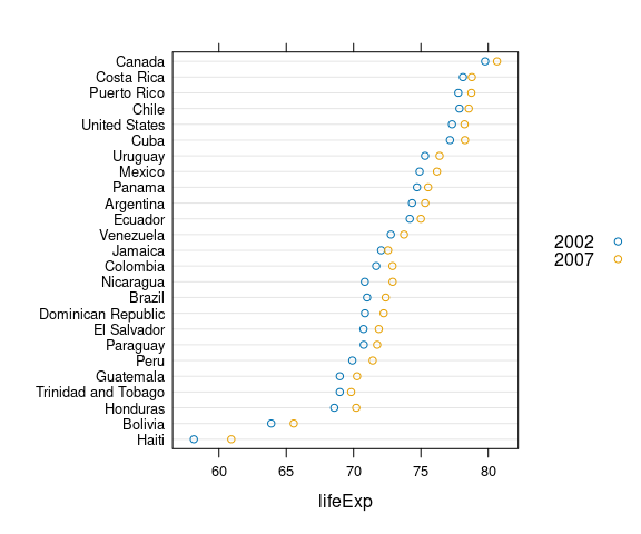 dotplot(reorder(country, lifeExp) ~ lifeExp,
