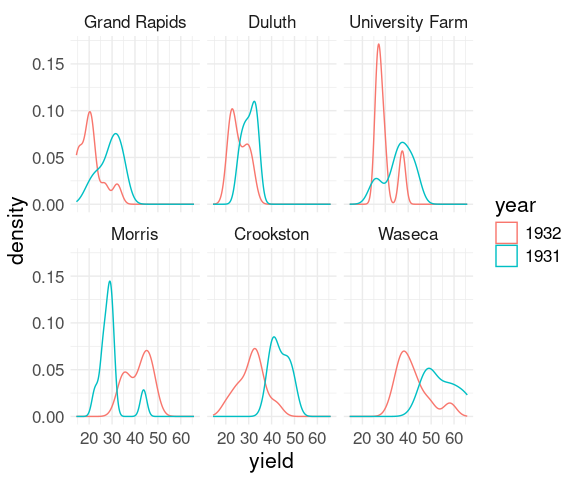 ggplot(mutate(barley, year = reorder(year, -yield))) +