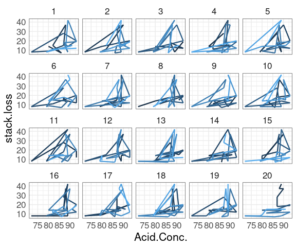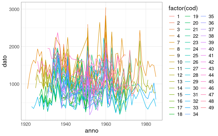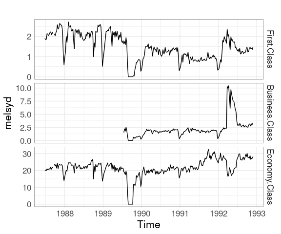 LS0tCnRpdGxlOiAiUGxvdHMgZm9yIE11bHRpcGxlIFRpbWUgU2VyaWVzIgpvdXRwdXQ6CiAgaHRtbF9kb2N1bWVudDoKICAgIHRvYzogeWVzCiAgICBjb2RlX2ZvbGRpbmc6IHNob3cKICAgIGNvZGVfZG93bmxvYWQ6IHRydWUKLS0tCgo8bGluayByZWw9InN0eWxlc2hlZXQiIGhyZWY9InN0YXQ0NTgwLmNzcyIgdHlwZT0idGV4dC9jc3MiIC8+CjxzdHlsZSB0eXBlPSJ0ZXh0L2NzcyI+IC5yZW1hcmstY29kZSB7IGZvbnQtc2l6ZTogODUlOyB9IDwvc3R5bGU+CmBgYHtyIHNldHVwLCBpbmNsdWRlID0gRkFMU0V9CnNvdXJjZShoZXJlOjpoZXJlKCJzZXR1cC5SIikpCmtuaXRyOjpvcHRzX2NodW5rJHNldChjb2xsYXBzZSA9IFRSVUUsIG1lc3NhZ2UgPSBGQUxTRSwKICAgICAgICAgICAgICAgICAgICAgIGZpZy5oZWlnaHQgPSA1LCBmaWcud2lkdGggPSA2LCBmaWcuYWxpZ24gPSAiY2VudGVyIikKCm9wdGlvbnMoaHRtbHRvb2xzLmRpci52ZXJzaW9uID0gRkFMU0UpCgpzZXQuc2VlZCgxMjM0NSkKbGlicmFyeShnZ3Bsb3QyKQpsaWJyYXJ5KGxhdHRpY2UpCmxpYnJhcnkodGlkeXZlcnNlKQpsaWJyYXJ5KGdyaWRFeHRyYSkKbGlicmFyeShmb3JlY2FzdCkKdGhlbWVfc2V0KHRoZW1lX21pbmltYWwoKSArCiAgICAgICAgICB0aGVtZSh0ZXh0ID0gZWxlbWVudF90ZXh0KHNpemUgPSAxNiksCiAgICAgICAgICAgICAgICBwYW5lbC5ib3JkZXIgPSBlbGVtZW50X3JlY3QoY29sb3IgPSAiZ3JleTMwIiwgZmlsbCA9IE5BKSkpCmBgYAoKCiMjIE11bHRpcGxlIFRpbWUgU2VyaWVzCgpTb21lIHF1ZXN0aW9ucyBmb3IgbXVsdGlwbGUgdGltZSBzZXJpZXM6CgotIEhvdyBkbyB0aGUgc2VyaWVzIGJlaGF2ZSBpbmRpdmlkdWFsbHk/CgotIEhvdyBhcmUgdGhlIHNlcmllcyByZWxhdGVkPwoKLSBEb2VzIG9uZSBzZXJpZXMgbGVhZCBvciBsYWcgdGhlIG90aGVycz8KClNvbWUgb3B0aW9ucyBmb3IgcGxvdHRpbmcgbXVsdGlwbGUgc2VyaWVzOgoKLSBzZXBhcmF0ZSBwYW5lbHMgaW4gYSB0cmVsbGlzIGRpc3BsYXk7CgotIG11bHRpcGxlIHNlcmllcyBpbiBhIHNpbmdsZSBwbG90IC0gdGhpcyB3aWxsIHJlcXVpcmUgc3RhbmRhcmRpemluZwogIGlmIHRoZSBzY2FsZXMgdmFyeSBzdWJzdGFudGlhbGx5OwoKLSBhIG11bHRpdmF0aWF0ZSBwbG90IHdpdGggdGltZSByZXByZXNlbnRlZCBieSBjb25uZWN0aW5nIGxpbmUKICBzZWdtZW50cyBvciBhbmltYXRpb24uCgpBbm90aGVyIG9wdGlvbiBmb3IgdHdvIHRpbWUgc2VyaWVzOgoKLSB1c2UgYSBzZXBhcmF0ZSBgeWAgYXhpcyBmb3IgZWFjaC4KClRoaXMgaXMgdXN1YWxseSBhIGJhZCBpZGVhLgoKU29tZSBkYXRhIHN0cnVjdHVyZXMgZm9yIG11bHRpcGxlIHRpbWUgc2VyaWVzOgoKKiBgbXRzYCBvYmplY3RzIGNyZWF0ZWQgYnkgYHRzKClgLgoKICAgIC0gQWxsIHNlcmllcyBoYXZlIHRvIGJlIG51bWVyaWMuCiAgICAtIGBhdXRvcGxvdGAgbWV0aG9kcyBtYXkgYmUgc3VmZmljaWVudC4KCiogUmVndWxhciBkYXRhIGZyYW1lcy4KCiAgICAtIFRoZSBzZXJpZXMgd2lsbCBoYXZlIHRvIGJlIHBsb3R0ZWQgaW4gc2VwYXJhdGUgbGF5ZXJzLAogICAgLSBvciB0aGUgZGF0YSBmcmFtZXMgd2lsbCBuZWVkIGNvbnZlcnRpbmcgaW50byBsb25nIGZvcm0uCgoKIyMgQ3JpbWVhbiBXYXIgQ2FzdWFsdGllcwoKVGhlIGBIaXN0RGF0YWAgcGFja2FnZSBjb250YWlucyB0aGUgZGF0YSB1c2VkIGJ5IEZsb3JlbmNlIE5pZ2h0aW5nYWxlCnRvIGNhbGwgYXR0ZW50aW9uIHRvIHRlcnJpYmxlIHNhbml0YXJ5IGNvbmRpdGlvbnMgZm9yIHRoZSBCcml0aWNoIGFybXkKaW4gQ3JpbWVhLgoKYGBge3J9CmRhdGEoTmlnaHRpbmdhbGUsIHBhY2thZ2UgPSAiSGlzdERhdGEiKQpoZWFkKHNlbGVjdChOaWdodGluZ2FsZSwgLURhdGUpKQpgYGAKCkEgcGxvdCBvZiB0aGUgYERpc2Vhc2VgLCBgV291bmRzYCwgYW5kIGBPdGhlcmA6CgpgYGB7ciBuaWdodC10cy1hdXRvLCBlY2hvID0gRkFMU0UsIGZpZy53aWR0aCA9IDcuNX0KbkRXTyA8LSBzZWxlY3QoTmlnaHRpbmdhbGUsCiAgICAgICAgICAgICAgIERpc2Vhc2UsIFdvdW5kcywgT3RoZXIpIHw+CiAgICB0cyhzdGFydCA9IGMoMTg1NCwgNCksIGZyZXF1ZW5jeSA9IDEyKQoKYXV0b3Bsb3QobkRXTykKYGBgCmBgYHtyIG5pZ2h0LXRzLWF1dG8sIGV2YWwgPSBGQUxTRX0KYGBgCgpVc2luZyB0aGUgcmF0ZSB2YXJpYWJsZXMgcHJvZHVjZXMgYSB2ZXJ5IHNpbWlsYXIgcGF0dGVybjoKCmBgYHtyIG5pZ2h0LXJhdGUtdHMtYXV0bywgZWNobyA9IEZBTFNFLCBmaWcud2lkdGggPSA3LjV9Cm5EV08ucmF0ZSA8LSBzZWxlY3QoTmlnaHRpbmdhbGUsCiAgICAgICAgICAgICAgICAgICAgZW5kc193aXRoKCJyYXRlIikpIHw+CiAgICB0cyhzdGFydCA9IGMoMTg1NCwgNCksIGZyZXF1ZW5jeSA9IDEyKQoKYXV0b3Bsb3QobkRXTy5yYXRlKQpgYGAKYGBge3IgbmlnaHQtcmF0ZS10cy1hdXRvLCBldmFsID0gRkFMU0V9CmBgYAoKVGhlIGFybXkgc2l6ZSBkb2VzIG5vdCB2YXJ5IGVub3VnaCBvdmVyIHRoZSB0aW1lIHdoZXJlIHRoZSBjYXN1YWx0aWVzCmFyZSBoaWdoIHRvIGFmZmVjdCB0aGUgcGF0dGVybiBtdWNoOgoKYGBge3IgbmlnaHQtYXJteS10cy1hdXRvLCBlY2hvID0gRkFMU0V9Cm5Bcm15IDwtIHNlbGVjdChOaWdodGluZ2FsZSwgQXJteSkgfD4KICAgIHRzKHN0YXJ0ID0gYygxODU0LCA0KSwgZnJlcXVlbmN5ID0gMTIpCgphdXRvcGxvdChuQXJteSkKYGBgCmBgYHtyIG5pZ2h0LWFybXktdHMtYXV0bywgZXZhbCA9IEZBTFNFfQpgYGAKCkluc3RlYWQgb2Ygc2hvd2luZyB0aHJlZSBzZXJpZXMgaW4gb25lIHBsb3QgeW91IGNhbiBhbHNvIHVzZSBmYWNldGluZy4KCmBgYHtyIG5pZ2h0LWF1dG8tZmFjZXQsIGVjaG8gPSBGQUxTRX0KYXV0b3Bsb3QobkRXTywgZmFjZXRzID0gVFJVRSkKYGBgCmBgYHtyIG5pZ2h0LWF1dG8tZmFjZXQsIGV2YWwgPSBGQUxTRX0KYGBgCgpUbyBjcmVhdGUgdGhlIHBsb3Qgb2YgYERpc2Vhc2VgLCBgV291bmRzYCwgYW5kIGBPdGhlcmAgdXNpbmcgYmFzaWMKYGdncGxvdGAgaXQgaXMgYmVzdCB0byBmaXJzdCBjb252ZXJ0IHRoZSBkYXRhIGludG8gbG9uZyBmb3JtLgoKWW91IGNhbiBjcmVhdGUgYSBsb25nIHZlcnNpb24gb2YgdGhlIGRhdGEsIHVzaW5nIGVpdGhlciBgcGl2b3RfbG9uZ2VyYApvciBgYnJvb206OnRpZHlgLgoKVXNpbmcgYGJyb29tOnRpZHlgIG9uIHRoZSBgbXRzYCBvYmplY3Q6CgpgYGB7ciBuaWdodC1nZ3Bsb3QtYnJvb20sIGVjaG8gPSBGQUxTRSwgZmlnLndpZHRoID0gNy41fQpicm9vbTo6dGlkeShuRFdPKSB8PgogICAgcmVuYW1lKERhdGUgPSBpbmRleCwKICAgICAgICAgICBEZWF0aHMgPSB2YWx1ZSwKICAgICAgICAgICBDYXVzZSA9IHNlcmllcykgfD4KICAgIGdncGxvdChhZXMoeCA9IERhdGUsCiAgICAgICAgICAgICAgIHkgPSBEZWF0aHMsCiAgICAgICAgICAgICAgIGNvbG9yID0gQ2F1c2UpKSArCiAgICBnZW9tX2xpbmUoKQpgYGAKYGBge3IgbmlnaHQtZ2dwbG90LWJyb29tLCBldmFsID0gRkFMU0V9CmBgYAoKVXNpbmcgYHBpdm90X2xvbmdlcmAgb24gdGhlIG9yaWdpbmFsIGRhdGEgZnJhbWU6CgpgYGB7ciBuaWdodC1nZ3Bsb3QtcGl2b3QtbG9uZ2VyLCBlY2hvID0gRkFMU0UsIGZpZy53aWR0aCA9IDcuNX0Kc2VsZWN0KE5pZ2h0aW5nYWxlLAogICAgICAgRGF0ZSwgRGlzZWFzZSwgV291bmRzLCBPdGhlcikgfD4KICAgIHBpdm90X2xvbmdlcigtRGF0ZSwKICAgICAgICAgICAgICAgICBuYW1lc190byA9ICJDYXVzZSIsCiAgICAgICAgICAgICAgICAgdmFsdWVzX3RvID0gIkRlYXRocyIpIHw+CiAgICBnZ3Bsb3QoYWVzKHggPSBEYXRlLAogICAgICAgICAgICAgICB5ID0gRGVhdGhzLAogICAgICAgICAgICAgICBjb2xvciA9IENhdXNlKSkgKwogICAgZ2VvbV9saW5lKCkKYGBgCmBgYHtyIG5pZ2h0LWdncGxvdC1waXZvdC1sb25nZXIsIGV2YWwgPSBGQUxTRX0KYGBgCgpVc2luZyBmYWNldGluZyBpbnN0ZWFkIG9mIGEgc2luZ2xlIHBsb3Q6CgpgYGB7ciBuaWdodC1nZ3Bsb3QtZmFjZXQsIGVjaG8gPSBGQUxTRX0Kc2VsZWN0KE5pZ2h0aW5nYWxlLAogICAgICAgRGF0ZSwgRGlzZWFzZSwgV291bmRzLCBPdGhlcikgfD4KICAgIHBpdm90X2xvbmdlcigtRGF0ZSwKICAgICAgICAgICAgICAgICBuYW1lc190byA9ICJDYXVzZSIsCiAgICAgICAgICAgICAgICAgdmFsdWVzX3RvID0gIkRlYXRocyIpIHw+CiAgICBnZ3Bsb3QoYWVzKHggPSBEYXRlLCB5ID0gRGVhdGhzKSkgKwogICAgZ2VvbV9saW5lKCkgKwogICAgZmFjZXRfd3JhcCh+IENhdXNlLCBuY29sID0gMSkKYGBgCmBgYHtyIG5pZ2h0LWdncGxvdC1mYWNldCwgZXZhbCA9IEZBTFNFfQpgYGAKClRvIGZvY3VzIG9uIHRoZSBzaGFwZSBvZiB0aGUgY3VydmVzIGl0IGlzIG9mdGVuIHVzZWZ1bCB0byBhbGxvdyB0aGUKdmVydGljYWwgYXhpcyByYW5nZXMgdG8gYWRqdXN0IHRvIHRoZSBkYXRhOgoKYGBge3IgbmlnaHQtZ2dwbG90LWZhY2V0LWZyZWUteSwg
