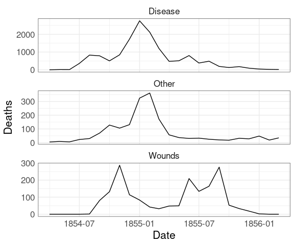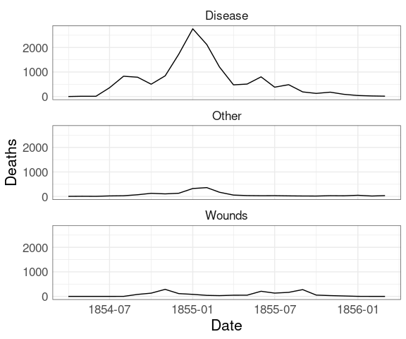 To create the plot of Disease, Wounds, and Other using basic ggplot it is best to first convert the data into long form.