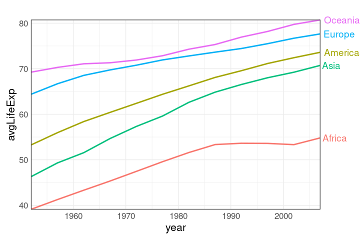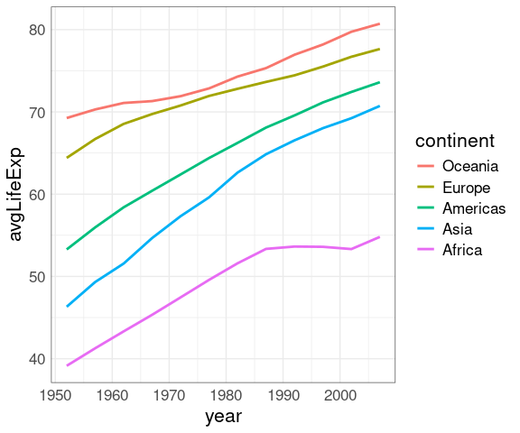 summarize(avgLifeExp = mean(lifeExp)) |>