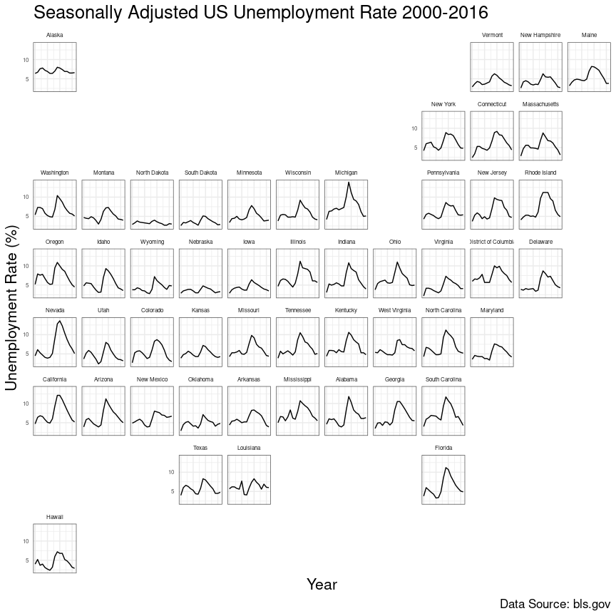 labs(title = "Seasonally Adjusted US Unemployment Rate 2000-2016",