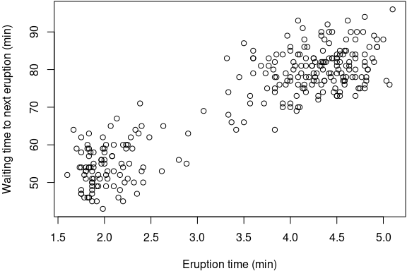 The value of the variable faithful is a data frame with two variables recorded for eruptions of the Old Faithful geyser in Yellowstone National Park: