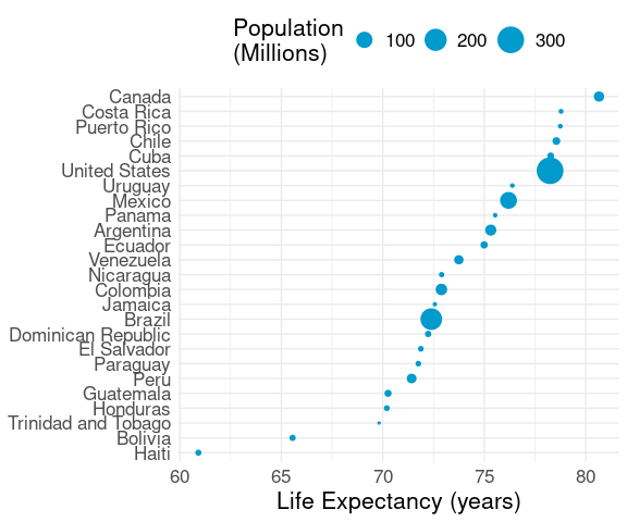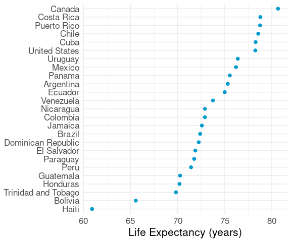 ggplot(le_am_2007, aes(y = reorder(country, lifeExp),