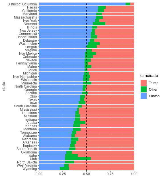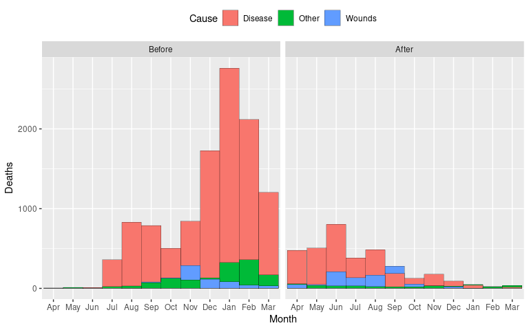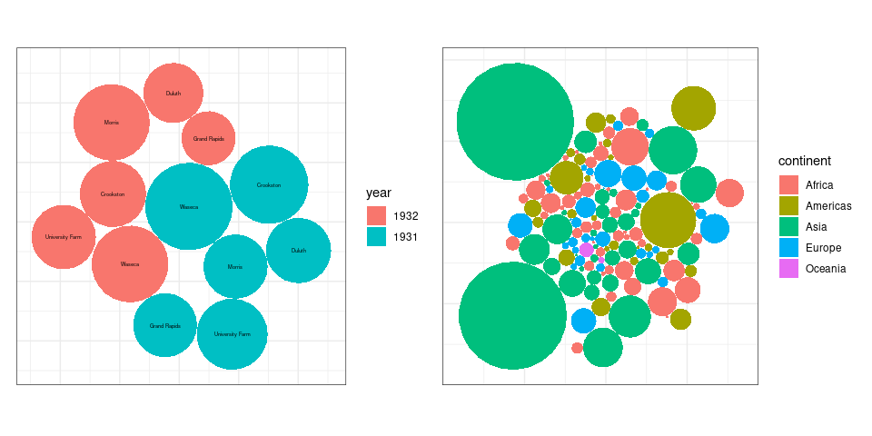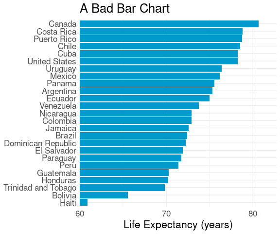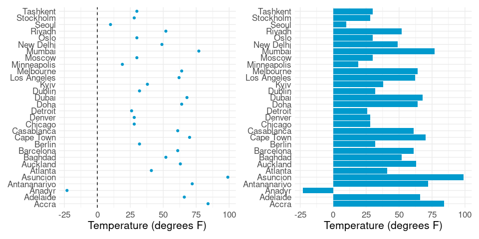 LS0tCnRpdGxlOiAiVmlzdWFsaXppbmcgQW1vdW50cyIKb3V0cHV0OgogIGh0bWxfZG9jdW1lbnQ6CiAgICB0b2M6IHllcwogICAgY29kZV9mb2xkaW5nOiAiaGlkZSIKICAgIGNvZGVfZG93bmxvYWQ6IHRydWUKLS0tCgo8bGluayByZWw9InN0eWxlc2hlZXQiIGhyZWY9InN0YXQ0NTgwLmNzcyIgdHlwZT0idGV4dC9jc3MiIC8+CjwhLS0gdGl0bGUgYmFzZWQgb24gV2lsa2UncyBjaGFwdGVyIC0tPgoKYGBge3Igc2V0dXAsIGluY2x1ZGUgPSBGQUxTRX0Kc291cmNlKGhlcmU6OmhlcmUoInNldHVwLlIiKSkKa25pdHI6Om9wdHNfY2h1bmskc2V0KGNvbGxhcHNlID0gVFJVRSwgbWVzc2FnZSA9IEZBTFNFLAogICAgICAgICAgICAgICAgICAgICAgZmlnLmhlaWdodCA9IDUsIGZpZy53aWR0aCA9IDYsIGZpZy5hbGlnbiA9ICJjZW50ZXIiKQoKbGlicmFyeShsYXR0aWNlKQpsaWJyYXJ5KHRpZHl2ZXJzZSkKbGlicmFyeShncmlkRXh0cmEpCmxpYnJhcnkoc2NhbGVzKQpzZXQuc2VlZCgxMjM0NSkKYGBgCgpgYGB7ciwgaW5jbHVkZSA9IEZBTFNFfQpzb3VyY2UoaGVyZTo6aGVyZSgiZGF0YXNldHMuUiIpKQpgYGAKCgojIyBWaXN1YWxpemF0aW9uIGFuZCBDb21wYXJpc29uCgpBIHZpc3VhbGl6YXRpb24gb2YgYSBzaW5nbGUgdmFsdWUgd2l0aG91dCBzb21lIGNvbXBhcmF0aXZlIGNvbnRleHQgaXMKcmFyZWx5IHVzZWZ1bAoKYGBge3IsIGVjaG8gPSBGQUxTRX0KbGlicmFyeShnZ3Bsb3QyKQpsaWJyYXJ5KHNjYWxlcykKZ2dwbG90KCkgKwogICAgZ2VvbV9wb2ludChhZXMoeCA9IDAsIHkgPSAwKSwKICAgICAgICAgICAgICAgc2hhcGUgPSAyMSwgc2l6ZSA9IDE1MCwgZmlsbCA9IG11dGVkKCJibHVlIikpICsKICAgIGdlb21fdGV4dChhZXMoeCA9IDAsIHkgPSAwLCBsYWJlbCA9IDIwMCksIHNpemUgPSA1MCwgY29sb3IgPSAid2hpdGUiKSArCiAgICB0aGVtZV92b2lkKCkKYGBgCgpVc2VmdWwgdmlzdWFsaXphdGlvbnMgYWxtb3N0IGFsd2F5cyBpbnZvbHZlIGNvbXBhcmlzb25zLgoKKiBwb3NpdGlvbiBvZiBhIHZhbHVlIG9uIGFuIGF4aXMKCiogcmVsYXRpdmUgcG9zaXRpb24gb2YgdHdvIHZhbHVlcwoKKiByZWxhdGl2ZSBtYWduaXR1ZGVzIG9mIHR3byB2YWx1ZXMKCkEgc2ltcGxlIGFuZCBjb21tb24gc2V0dGluZzogVmlzdWFsaXppbmcgYSBtZWFzdXJlbWVudCBvciBzdW1tYXJ5IGZvcgplYWNoIG9mIGEgc2V0IG9mIGNhdGVnb3JpZXMuCgpTb21lIG9mIHRoZSBtb3JlIGNvbW1vbiB2aXN1YWxpemF0aW9uczoKCiogRG90IENoYXJ0cyAoYWxzbyBjYWxsZWQgQ2xldmVsYW5kIERvdCBDaGFydHMpCgoqIEJhciBDaGFydHMKICAqIEdyb3VwZWQgQmFyIENoYXJ0cyAoQ2x1c3RlcmVkIEJhciBDaGFydHMpCiAgKiBTdGFja2VkIEJhciBDaGFydHMKICAqIERpdmVyZ2luZyBCYXIgQ2hhcnRzCgoqIEhlYXQgTWFwcwoKKiBCdWJibGUgQ2hhcnRzCgpTb21lIGxlc3MgZnJlcXVlbnRseSB1c2VkIHZpc3VhbGl6YXRpb25zOgoKKiBXYXRlcmZhbGwgQ2hhcnRzCiogUG9sYXIgQXJlYSBDaGFydHMgKENveGNvbWIgQ2hhcnRzKQoqIER1bWJiZWxsIENoYXJ0cwoKU29tZSBxdWVzdGlvbnMgdG8ga2VlcCBpbiBtaW5kOgoKKiBXaGF0IGNvbXBhcmlzb25zIGFuZCBvdGhlciBhc3Nlc3NtZW50cyBkbyB0aGVzZSB2aXN1YWxpemF0aW9ucyBzdXBwb3J0PwoKKiBIb3cgZG8gdGhlc2UgdmlzdWFsaXphdGlvbnMgc2NhbGUgdG8gbGFyZ2VyIGRhdGEgc2V0cz8KCgojIyBEb3QgUGxvdHMKCgojIyMgQmFzaWNzCgpPbmUgb2YgdGhlIHNpbXBsZXN0IHZpc3VhbGl6YXRpb25zIG9mIGEgc2luZ2xlIG51bWVyaWNhbCB2YXJpYWJsZSB3aXRoCmEgbW9kZXN0IG51bWJlciBvZiBvYnNlcnZhdGlvbnMgYW5kIGxhYmVscyBmb3IgdGhlIG9ic2VydmF0aW9ucyBpcyBhCl9kb3QgcGxvdF8sIG9yIF9DbGV2ZWxhbmQgZG90IHBsb3RfOgoKYGBge3IsIG1lc3NhZ2UgPSBGQUxTRSwgY2xhc3Muc291cmNlID0gImZvbGQtaGlkZSJ9CmxpYnJhcnkoZHBseXIpCmxpYnJhcnkoZ2dwbG90MikKbGlicmFyeShnYXBtaW5kZXIpCmxlX2FtXzIwMDcgPC0gZmlsdGVyKGdhcG1pbmRlciwKICAgICAgICAgICAgICAgICAgICAgeWVhciA9PSAyMDA3LAogICAgICAgICAgICAgICAgICAgICBjb250aW5lbnQgPT0gIkFtZXJpY2FzIikKdGhtIDwtIHRoZW1lX21pbmltYWwoKSArCiAgICB0aGVtZSh0ZXh0ID0gZWxlbWVudF90ZXh0KHNpemUgPSAxNikpCmdncGxvdChsZV9hbV8yMDA3LAogICAgICAgYWVzKHkgPSBjb3VudHJ5LCB4ID0gbGlmZUV4cCkpICsKICAgIGdlb21fcG9pbnQoY29sb3IgPSAiZGVlcHNreWJsdWUzIiwKICAgICAgICAgICAgICAgc2l6ZSA9IDIpICsKICAgIGxhYnMoeCA9ICJMaWZlIEV4cGVjdGFuY3kgKHllYXJzKSIsCiAgICAgICAgIHkgPSBOVUxMKSArCiAgICB0aG0KYGBgCmBgYHtyLCBlY2hvID0gRkFMU0UsIGV2YWwgPSBGQUxTRX0KIyMgdG8gb3JkZXIgYWxwaGFiZXRpY2FsbHkgZnJvbSB0b3AgdG8gYm90dG9tOgpsZV9hbV8yMDA3IDwtIG11dGF0ZShsZV9hbV8yMDA3LAogICAgICAgICAgICAgICAgICAgICBjb3VudHJ5ID0gZmFjdG9yKGNvdW50cnksIHJldihzb3J0KHVuaXF1ZShjb3VudHJ5KSwKICAgICAgICAgICAgICAgICAgICAgICAgICAgICAgICAgICAgICAgICAgICAgICAgICAgICAgICBkZXNjZW5kaW5nID0gVFJVKSkpKQpgYGAKClRoaXMgdmlzdWFsaXphdGlvbgoKKiBzaG93cyB0aGUgb3ZlcmFsbCBkaXN0cmlidXRpb24gb2YgdGhlIGRhdGEsIGFuZAoKKiBtYWtlcyBpdCBlYXN5IHRvIGxvY2F0ZSB0aGUgbGlmZSBleHBlY3RhbmN5IG9mIGEgcGFydGljdWxhciBjb3VudHJ5LgoKVW5sZXNzIHRoZXJlIGlzIGEgbmF0dXJhbCBvcmRlciB0byB0aGUgY2F0ZWdvcmllcyAoZS5nLiBtb250aHMgb2YgdGhlCnllYXIgb3IgZGF5cyBvZiB0aGUgd2VlaykgaXQgaXMgdXN1YWxseSBiZXR0ZXIgdG8gcmVvcmRlciB0byBtYWtlIHRoZQpwbG90IGluY3JlYXNpbmcgb3IgZGVjcmVhc2luZzoKCmBgYHtyLCBjbGFzcy5zb3VyY2UgPSAiZm9sZC1oaWRlIn0KZ2dwbG90KGxlX2FtXzIwMDcsCiAgICAgICBhZXMoeSA9IHJlb3JkZXIoY291bnRyeSwgbGlmZUV4cCksCiAgICAgICAgICAgeCA9IGxpZmVFeHApKSArCiAgICBnZW9tX3BvaW50KGNvbG9yID0gImRlZXBza3libHVlMyIsCiAgICAgICAgICAgICAgIHNpemUgPSAyKSArCiAgICBsYWJzKHggPSAiTGlmZSBFeHBlY3RhbmN5ICh5ZWFycykiLAogICAgICAgICB5ID0gTlVMTCkgKwogICAgdGhtCmBgYAoKKiBMb2NhdGluZyBhIHBhcnRpY3VsYXIgY291bnRyeSBpcyBhIGxpdHRsZSBtb3JlIGRpZmZpY3VsdC4KCiogQnV0IHRoZSBzaGFwZSBvZiB0aGUgZGlzdHJpYnV0aW9uIGlzIG1vcmUgYXBwYXJlbnQuCgoqIEFwcHJveGltYXRlIG1lZGlhbiBhbmQgcXVhcnRpbGVzIGNhbiBiZSByZWFkIG9mZiBlYXNpbHkuCgpEb3QgcGxvdHMgYXJlIHBhcnRpY3VsYXJseSBhcHByb3ByaWF0ZSBmb3IgaW50ZXJ2YWwgZGF0YS4KCiogdGhleSBvZnRlbiBkbyBub3Qgc2hvdyB0aGUgb3JpZ2luOwoKKiB0aGV5IGZvY3VzIHRoZSB2aWV3ZXIncyBhdHRlbnRpb24gb24gZGlmZmVyZW5jZXMuCgpEb3QgcGxvdHMgYXJlIG9mdGVuIHZlcnkgdXNlZnVsIGZvciBncm91cCBzdW1tYXJpZXMgbGlrZSB0b3RhbHMgb3IKYXZlcmFnZXMuCgpGb3IgdGhlIGBiYXJsZXlgIGRhdGEsIHRvdGFsIHlpZWxkIHdpdGhpbiBlYWNoIHNpdGUsIGFkZGluZyB1cAphY3Jvc3MgYWxsIHZhcmlldGllcyBhbmQgYm90aCB5ZWFycywgY2FuIGJlIGNvbXB1dGVkIGFzCgpgYGB7cn0KYl90b3Rfc2l0ZSA8LQogICAgZ3JvdXBfYnkoYmFybGV5LCBzaXRlKSB8PgogICAgc3VtbWFyaXplKHlpZWxkID0gc3VtKHlpZWxkKSkKYGBgCgpUaGUgdG90YWxzIGNhbiB0aGVuIGJlIHZpc3VhbGl6ZWQgaW4gYSBkb3QgcGxvdDoKCmBgYHtyLCBjbGFzcy5zb3VyY2UgPSAiZm9sZC1oaWRlIn0KZ2dwbG90KGJfdG90X3NpdGUsIGFlcyh4ID0geWllbGQsIHkgPSBzaXRlKSkgKwogICAgZ2VvbV9wb2ludChjb2xvciA9ICJkZWVwc2t5Ymx1ZTMiLCBzaXplID0gMi41KSArCiAgICBsYWJzKHggPSAiVG90YWwgWWllbGQgKGJ1c2hlbHMvYWNyZSkiLCB5ID0gTlVMTCkgKwogICAgdGhtCmBgYAoKCiMjIyBMYXJnZXIgRGF0YSBTZXRzCgpGb3IgbGFyZ2VyIGRhdGEgc2V0cywgbGlrZSB0aGUgYGNpdHl0ZW1wc2AgZGF0YSB3aXRoIGByIG5yb3coY2l0eXRlbXBzKWAKb2JzZXJ2YXRpb25zLCBvdmVyLXBsb3R0aW5nIG9mIGxhYmVscyBiZWNvbWVzIGEgcHJvYmxlbToKCmBgYHtyLCBjbGFzcy5zb3VyY2UgPSAiZm9sZC1oaWRlIn0KZ2dwbG90KGNpdHl0ZW1wcywKICAgICAgIGFlcyh4ID0gdGVtcCwgeSA9IHJlb3JkZXIoY2l0eSwgdGVtcCkpKSArCiAgICBnZW9tX3BvaW50KGNvbG9yID0gImRlZXBza3libHVlMyIsIHNpemUgPSAwLjUpICsKICAgIGxhYnMoeCA9ICJUZW1wZXJhdHVyZSAoZGVncmVlcyBGKSIsIHkgPSBOVUxMKSArCiAgICB0aG0K