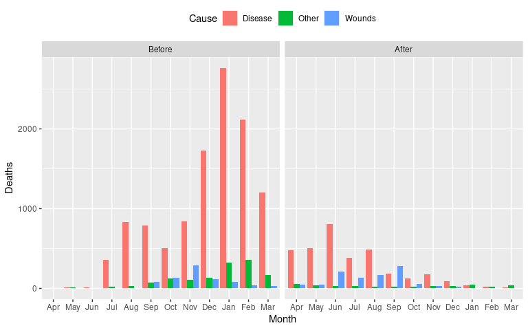 The bar chart produced by the following code has x axis labels that could be improved: