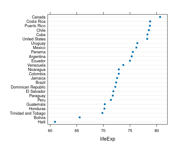 dotplot(reorder(country, lifeExp) ~ lifeExp,