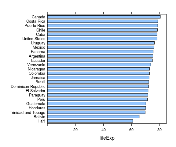 barchart(reorder(country, lifeExp) ~ lifeExp,