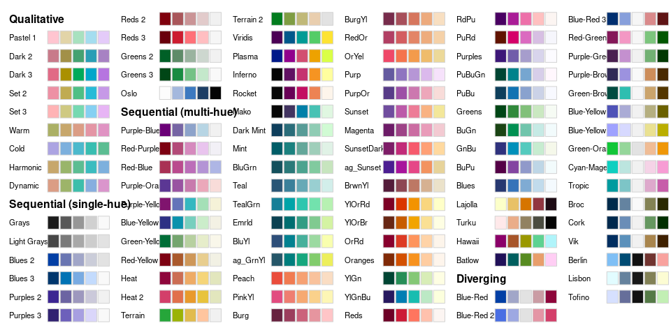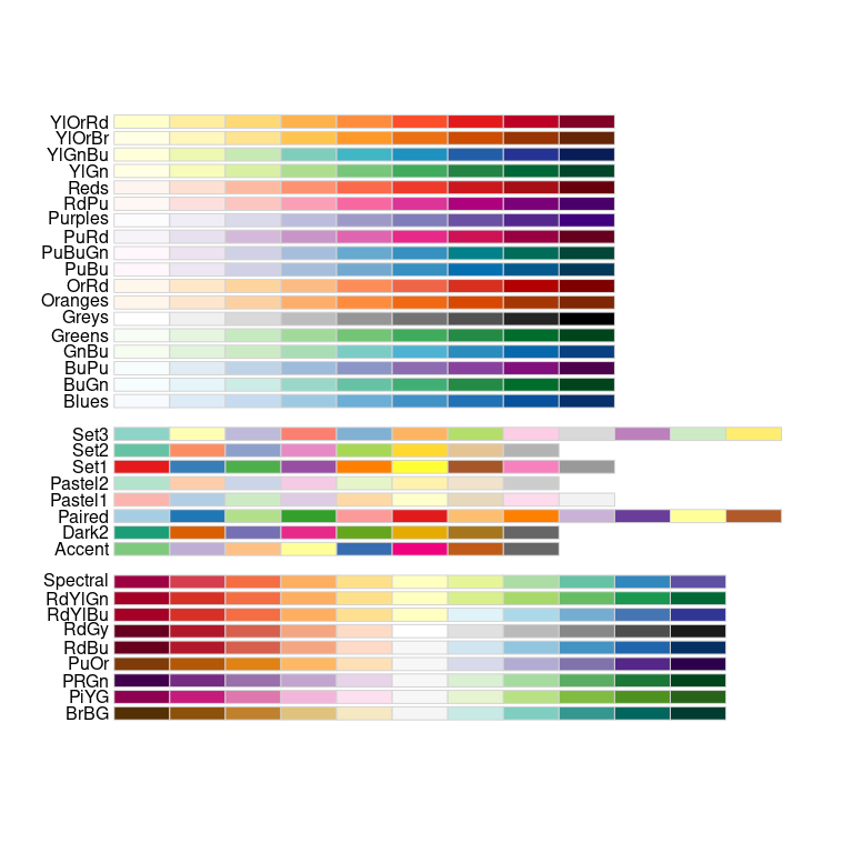 Harrower, M. A. and Brewer, C. M. (2003). ColorBrewer.org: An online tool for selecting color schemes for maps. The Cartographic Journal, 40, 27–37. ColorBrewer web site. The RColopBrewer package provides an R interface.