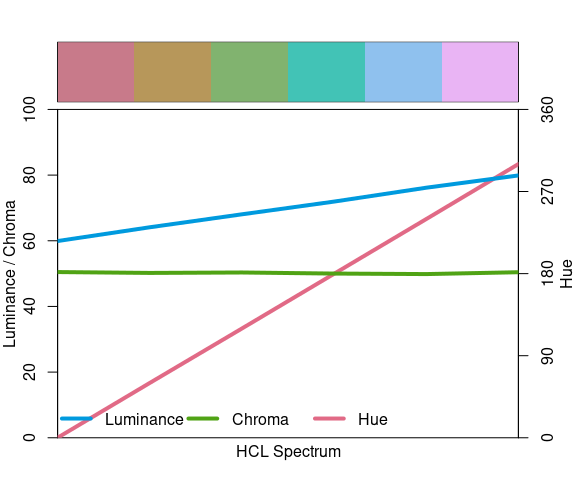 rain6 <- hcl(seq(0, 360 * 5 / 6, len = 6), 50, seq(60, 80, len = 6))