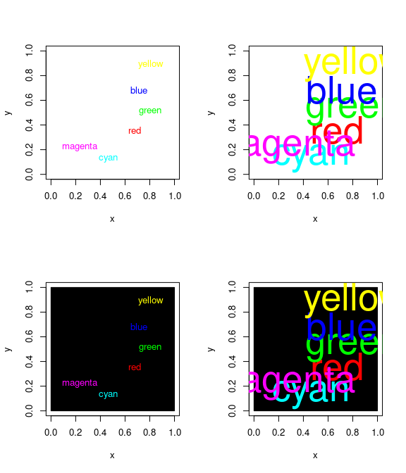 cols <- c("red", "green", "blue", "yellow", "cyan", "magenta")