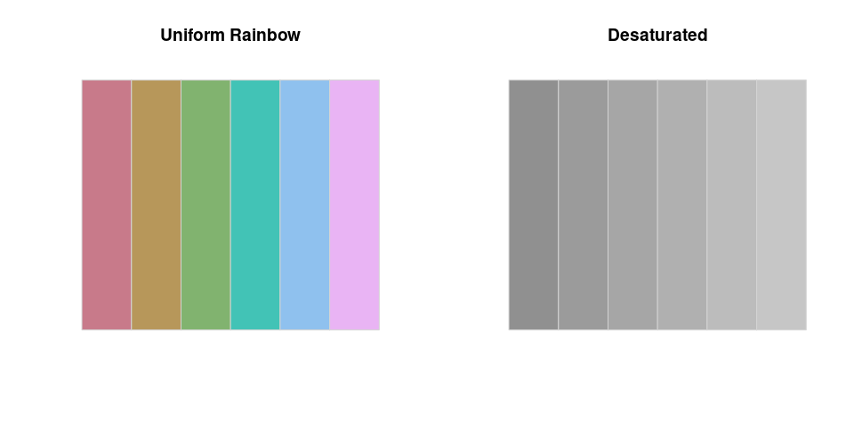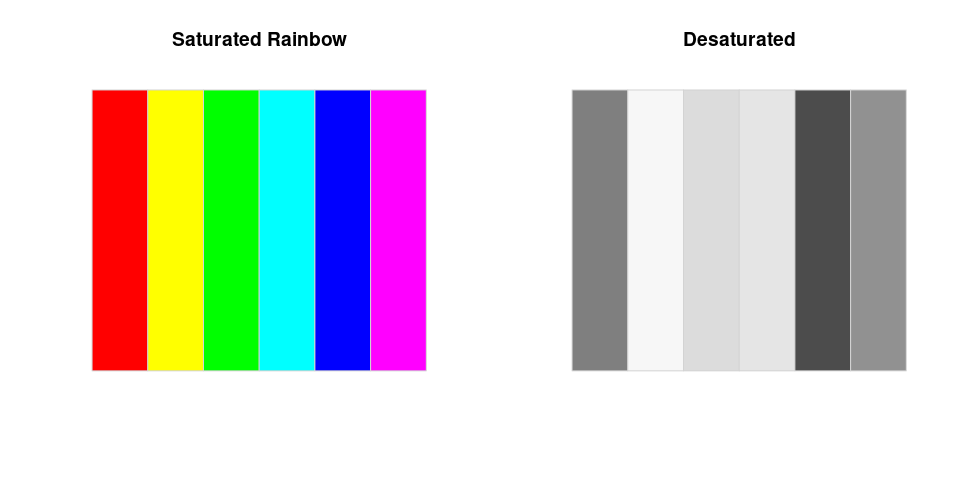 pal(desaturate(rainbow(6)), main = "Desaturated")