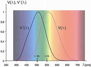 Light sensitivity for different wave lengths in daylight conditions (photopic vision) and under dark adapted conditions (scotopic vision):
