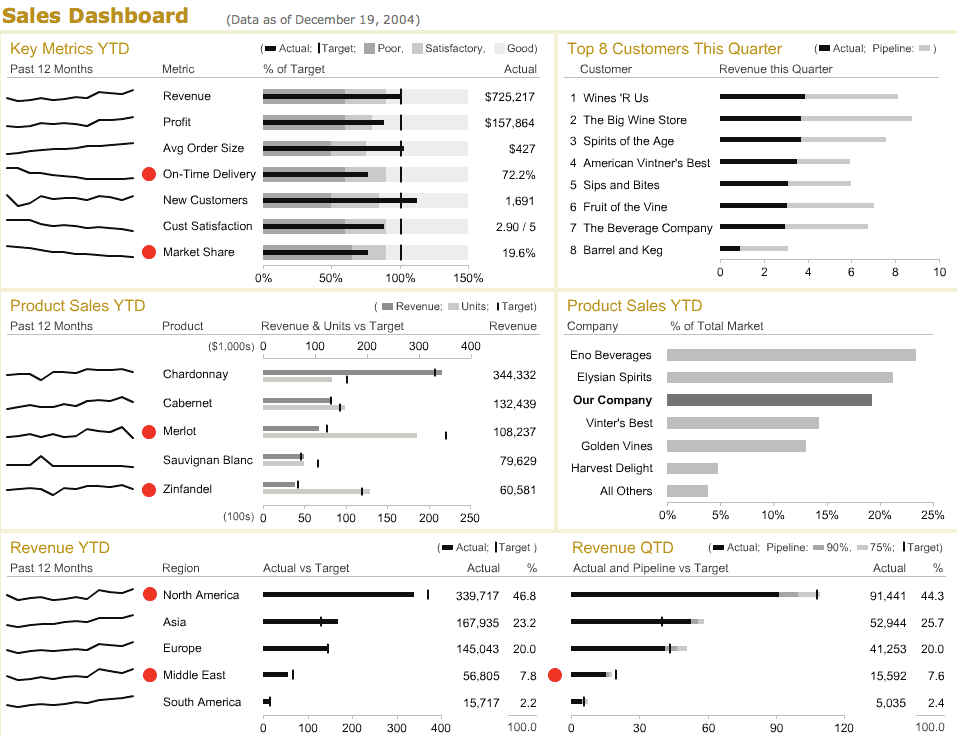 Some dashboards take the metaphor too far by showing dials that take up lots of space and distract.