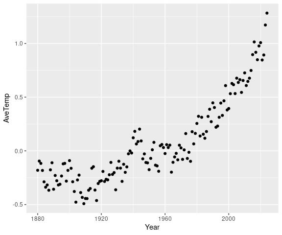 ggplot(atemp, aes(x = Year, y = AveTemp)) +