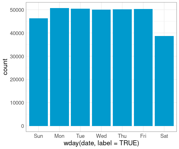 LS0tCnRpdGxlOiAiRGF0ZXMgYW5kIFRpbWVzIgpvdXRwdXQ6CiAgaHRtbF9kb2N1bWVudDoKICAgIHRvYzogeWVzCiAgICBjb2RlX2ZvbGRpbmc6IHNob3cKICAgIGNvZGVfZG93bmxvYWQ6IHRydWUKLS0tCgo8bGluayByZWw9InN0eWxlc2hlZXQiIGhyZWY9InN0YXQ0NTgwLmNzcyIgdHlwZT0idGV4dC9jc3MiIC8+CjxzdHlsZSB0eXBlPSJ0ZXh0L2NzcyI+IC5yZW1hcmstY29kZSB7IGZvbnQtc2l6ZTogODUlOyB9IDwvc3R5bGU+CmBgYHtyIHNldHVwLCBpbmNsdWRlID0gRkFMU0UsIG1lc3NhZ2UgPSBGQUxTRX0Kc291cmNlKGhlcmU6OmhlcmUoInNldHVwLlIiKSkKa25pdHI6Om9wdHNfY2h1bmskc2V0KGNvbGxhcHNlID0gVFJVRSwgbWVzc2FnZSA9IEZBTFNFLAogICAgICAgICAgICAgICAgICAgICAgZmlnLmhlaWdodCA9IDUsIGZpZy53aWR0aCA9IDYsIGZpZy5hbGlnbiA9ICJjZW50ZXIiKQoKc2V0LnNlZWQoMTIzNDUpCmxpYnJhcnkoZHBseXIpCmxpYnJhcnkoZ2dwbG90MikKbGlicmFyeShsYXR0aWNlKQpsaWJyYXJ5KGdyaWRFeHRyYSkKbGlicmFyeShwYXRjaHdvcmspCnNvdXJjZShoZXJlOjpoZXJlKCJkYXRhc2V0cy5SIikpCnRoZW1lX3NldCh0aGVtZV9taW5pbWFsKCkgKwogICAgICAgICAgdGhlbWUodGV4dCA9IGVsZW1lbnRfdGV4dChzaXplID0gMTYpLAogICAgICAgICAgICAgICAgcGFuZWwuYm9yZGVyID0gZWxlbWVudF9yZWN0KGNvbG9yID0gImdyZXkzMCIsIGZpbGwgPSBOQSkpKQpgYGAKCgojIyBCYWNrZ3JvdW5kCgpEYXRhIGFyZSBvZnRlbiBhc3NvY2lhdGVkIHdpdGggYSBwb2ludCBpbiB0aW1lLCBhIHBhcnRpY3VsYXIKCiogeWVhcjsKCiogbW9udGg7CgoqIGRheTsKCiogaG91ciwgbWludXRlLCBzZWNvbmQsIC4uLgoKU29tZSBpc3N1ZXMgd2l0aCBwb2ludHMgaW4gdGltZToKCiogTGVhcCB5ZWFycyBhbmQgbGVhcCBzZWNvbmRzLgoKKiBEYXlsaWdodCBzYXZpbmcgdGltZS4KCiogTG9jYWwgdGltZSBvcgogIFtfQ29vcmRpbmF0ZWQgVW5pdmVyc2FsIFRpbWUKICAgICAgKFVUQylfXShodHRwczovL3d3dy50aW1lYW5kZGF0ZS5jb20vdGltZS9hYm91dHV0Yy5odG1sKS4KCiogRm9yIGhpc3RvcmljYWwgZGF0YTogY2hhbmdlcyBpbiBjYWxlbmRhcnMuCgpSIGhhcyBkYXRhIHR5cGVzIHRvIHJlcHJlc2VudAoKKiBhIHBhcnRpY3VsYXIgZGF0ZSAoYERhdGVgKTsKCiogYSBwYXJ0aWN1bGFyIHNlY29uZCAoYFBPU0lYY3RgLCBkYXRlLXRpbWUpLgoKUiBzdG9yZXMgZGF0ZXMgYXMgZGF5cyBzaW5jZSBKYW51YXJ5IDEsIDE5NzAsIGFuZCBkYXRlLXRpbWVzIGFzIHRoZQp0aGUgbnVtYmVyIG9mIHNlY29uZHMgc2luY2UgbWlkbmlnaHQgb24gdGhhdCBkYXkgaW4KW19Db29yZGluYXRlZCBVbml2ZXJzYWwgVGltZV8KICAgIChVVEMpXShodHRwczovL3d3dy50aW1lYW5kZGF0ZS5jb20vdGltZS9hYm91dHV0Yy5odG1sKS4KCkRhdGUgb2JqZWN0cyBhcmUgbGVzcyBjb21wbGljYXRlZCB0aGFuIGRhdGEtdGltZSBvYmplY3RzLCBzbyBpZiB5b3UKb25seSBuZWVkIGRhdGVzIHlvdSBzaG91bGQgc3RpY2sgd2l0aCBkYXRlIG9iamVjdHMuCgpCYXNlIFIgcHJvdmlkZXMgbWFueSBmYWNpbGl0aWVzIGZvciBkZWFsaW5nIHdpdGggZGF0ZXMgYW5kIGRhdGUtdGltZXMuCgpUaGUgYGx1YnJpZGF0ZWAgcGFja2FnZSBwcm92aWRlcyBhIHVzZWZ1bCBpbnRlcmZhY2UuCgpgYGB7ciwgbWVzc2FnZSA9IEZBTFNFfQpsaWJyYXJ5KGx1YnJpZGF0ZSkKYGBgCgpUaGUKW19EYXRlcyBhbmQgVGltZXNfIGNoYXB0ZXJdKGh0dHBzOi8vcjRkcy5oYWRsZXkubnovZGF0ZXRpbWVzLmh0bWwpCm9mIFtfUiBmb3IgRGF0YSBTY2llbmNlX10oaHR0cHM6Ly9yNGRzLmhhZGxleS5uei8pIHByb3ZpZGVzIG1vcmUKZGV0YWlscy4KCgojIyBDcmVhdGluZyBEYXRlcyBhbmQgVGltZXMKCgojIyMgVG9kYXkgYW5kIE5vdwoKVGhlIGBsdWJyaWRhdGVgIGZ1bmN0aW9uIGB0b2RheSgpYCByZXR1cm5zIHRvZGF5J3MgZGF0ZSBhcyBhIGBEYXRlYCBvYmplY3Q6CgpgYGB7cn0KdG9kYXkoKQpgYGAKCmBgYHtyfQpjbGFzcyh0b2RheSgpKQpgYGAKClRoZSBgbHVicmlkYXRlYCBmdW5jdGlvbiBgbm93KClgIHJldHVybnMgdGhlIGN1cnJlbnQgZGF0ZS10aW1lIGFzIGEKYFBPU0lYY3RgIG9iamVjdDoKCmBgYHtyfQpub3coKQpgYGAKCmBgYHtyfQpjbGFzcyhub3coKSkKYGBgCgpUaGUgcHJpbnRlZCByZXByZXNlbnRhdGlvbiBmb2xsb3dzIHRoZSBpbnRlcm5hdGlvbmFsIHN0YW5kYXJkIGZvciB0aGUKcmVwcmVzZW50YXRpb24gb2YgZGF0ZXMgYW5kIHRpbWVzCihbSVNPODYwMV0oaHR0cHM6Ly9lbi53aWtpcGVkaWEub3JnL3dpa2kvSVNPXzg2MDEpKS4KCkRhdGUgYW5kIGRhdGUtdGltZSBvYmplY3RzIGNhbiBiZSB1c2VkIHdpdGggYWRkaXRpb24gYW5kIHN1YnRyYWN0aW9uOgoKYGBge3J9Cm5vdygpICsgMzYwMCAgIyMgb25lIGhvdXIgZnJvbSBub3cKYGBgCgpgYGB7cn0KdG9kYXkoKSAtIDcgICAjIyBvbmUgd2VlayBhZ28KYGBgCgoKIyMjIFBhcnNpbmcgRGF0ZXMgYW5kIFRpbWVzIEZyb20gU3RyaW5ncwoKU29tZSBjb21tb24gZGF0ZSBmb3JtYXRzOgoKYGBge3J9CmQxIDwtICIyMDI1LTA0LTE1IgpkMiA8LSAiQXByaWwgMTUsIDIwMjUiCmQzIDwtICIxNSBBcHJpbCAyMDI1IgpkNCA8LSAiMTUgQXByaWwgMjUiCmBgYAoKVGhlc2UgY2FuIGJlIGRlY29kZWQgYnkgdGhlIGZ1bmN0aW9ucyBgeW1kKClgLCBgbWR5KClgLCBhbmQgYGRteSgpYDoKCmBgYHtyfQp5bWQoZDEpCmBgYAoKYGBge3J9Cm1keShkMikKYGBgCgpgYGB7cn0KZG15KGQzKQpgYGAKCmBgYHtyfQpkbXkoZDQpCmBgYAoKQnkgZGVmYXVsdCwgdGhlc2UgZnVuY3Rpb25zIHVzZSB0aGUgY3VycmVudCBfbG9jYWxlXyBzZXR0aW5ncyBmb3IKaW50ZXJwcmV0aW5nIG1vbnRoIG5hbWVzIG9yIGFiYnJldmlhdGlvbnMuCgpgYGB7cn0KU3lzLmdldGxvY2FsZSgiTENfVElNRSIpCmBgYAoKSWYgeW91IG5lZWQgdG8gcGFyc2UgYSBGcmVuY2ggZGF0ZSB5b3UgbWlnaHQgdXNlCgpgYGB7cn0KZG15KCIxNSBBdnJpbCwgMjAyNSIsIGxvY2FsZSA9ICJmcl9GUi5VVEYtOCIpCmBgYAoKRGF0ZS10aW1lcyBjYW4gYmUgZGVjb2RlZCB3aXRoIGZ1bmN0aW9ucyBsaWtlIGBtZHlfaG1gOgoKYGBge3J9Cm1keV9obSgiQXByaWwgMTUsIDIwMjUsIDY6MTUgUE0iKQpgYGAKCm9yCgpgYGB7cn0KbWR5X2htcygiQXByaWwgMTUsIDIwMjUsIDY6MTU6MDggUE0iKQpgYGAKCkJ5IGRlZmF1bHQgdGhlc2UgYXNzdW1lIHRoZSB0aW1lIGlzIHNwZWNpZmllZCBpbiB0aGUgVVRDIHRpbWUgem9uZS4KCgojIyMgQ3JlYXRpbmcgRGF0ZXMgYW5kIFRpbWVzIGZyb20gQ29tcG9uZW50cwoKRGF0ZXMgY2FuIGJlIGNyZWF0ZWQgZnJvbSB5ZWFyLCBtb250aCwgYW5kIGRheSBieSBgbWFrZV9kYXRlKClgOgoKYGBge3J9Cm1ha2VfZGF0ZSgyMDI1LCA0LCAxNSkKYGBgCgpDcmVhdGluZyBhIGBkYXRlYCB2YXJpYWJsZSBmcm9tIHRoZSBgeWVhcmAsIGBtb250aGAsIGFuZCBgZGF5YAp2YXJpYWJsZXMgaW4gdGhlIE5ldyBZb3JrIENpdHkgYGZsaWdodHNgIHRhYmxlOgoKYGBge3J9CmxpYnJhcnkobnljZmxpZ2h0czEzKQpmbCA8LSBtdXRhdGUoZmxpZ2h0cywKICAgICAgICAgICAgIGRhdGUgPSBtYWtlX2RhdGUoeWVhciwgbW9udGgsIGRheSkpCmBgYAoKYGdncGxvdGAgYW5kIG90aGVyIGdyYXBoaWNzIHN5c3RlbXMga25vdyBob3cgdG8gbWFrZSB1c2VmdWwgYXhpcwpsYWJlbHMgZm9yIGRhdGVzOgoKYGBge3IsIGNsYXNzLnNvdXJjZSA9ICJmb2xkLWhpZGUifQpnZ3Bsb3QoY291bnQoZmwsIGRhdGUpKSArCiAgICBnZW9tX2xpbmUoYWVzKHggPSBkYXRlLCB5ID0gbikpCmBgYAoKV2Vla2RheS93ZWVrZW5kIGRpZmZlcmVuZXMgYXJlIGNsZWFybHkgdmlzaWJsZS4KCkRhdGUtdGltZXMgY2FuIGJlIGNyZWF0ZWQgZnJvbSB5ZWFyLCBtb250aCwgZGF5LCBob3VyLCBtaW51dGUsIGFuZCBzZWNvbmQKdXNpbmcgYG1ha2VfZGF0ZXRpbWUoKWA6CgpgYGB7cn0KbWFrZV9kYXRldGltZSgyMDI1LCA0LCAxNSwgMTgsIDE1KQpgYGAKCkFuIGF0dGVtcHQgdG8gcmVjcmVhdGUgdGhlIGB0aW1lX2hvdXJgIHZhcmlhYmxlIGluIHRoZSBmbGlnaHRzIHRhYmxlOgoKYGBge3J9CmZsIDwtIG11dGF0ZShmbCwKICAgICAgICAgICAgIHRoID0gbWFrZV9kYXRldGltZSh5ZWFyLCBtb250aCwgZGF5LAogICAgICAgICAgICAgICAgICAgICAgICAgICAgICAgIGhvdXIpKQpgYGAKClRoaXMgZG9lcyBub3QgcXVpdGUgcmUtY3JlYXRlIHRoZSBgdGltZV9ob3VyYCB2YXJpYWJsZToKYGBge3J9CmlkZW50aWNhbChmbCR0aCwgZmwkdGltZV9ob3VyKQpgYGAKCmBgYHtyfQpmbCR0aFsxXQpmbCR0aW1lX2hvdXJbMV0KYGBgCgpCeSBkZWZhdWx0LCBgbWFrZV9kYXRldGltZSgpYCBhc3N1bWVzIHRoZSB0aW1lIHBvaW50cyBpdCBpcyBnaXZlbiBhcmUgaW4gVVRDLgoKVGhlIGB0aW1lX2hvdXJgIHZhcmlhYmxlIGlzIHVzaW5nIGxvY2Fs