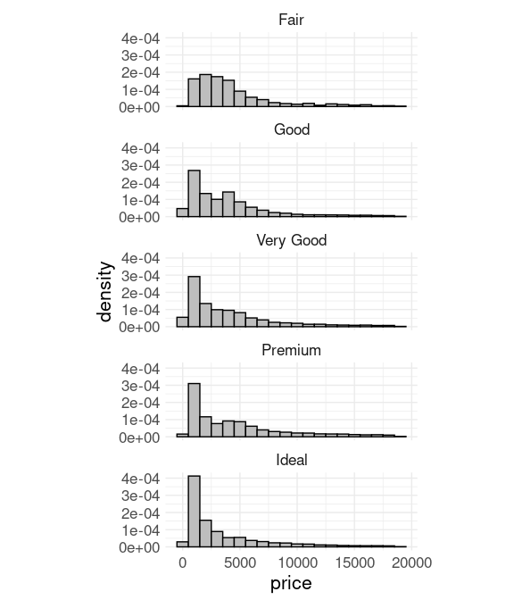 LS0tCnRpdGxlOiAiVmlzdWFsaXppbmcgRGlzdHJpYnV0aW9ucyIKb3V0cHV0OgogIGh0bWxfZG9jdW1lbnQ6CiAgICB0b2M6IHllcwogICAgY29kZV9mb2xkaW5nOiBzaG93CiAgICBjb2RlX2Rvd25sb2FkOiB0cnVlCi0tLQoKPGxpbmsgcmVsPSJzdHlsZXNoZWV0IiBocmVmPSJzdGF0NDU4MC5jc3MiIHR5cGU9InRleHQvY3NzIiAvPgo8IS0tIHRpdGxlIGJhc2VkIG9uIFdpbGtlJ3MgY2hhcHRlciAtLT4KCmBgYHtyIHNldHVwLCBpbmNsdWRlID0gRkFMU0UsIG1lc3NhZ2UgPSBGQUxTRX0Kc291cmNlKGhlcmU6OmhlcmUoInNldHVwLlIiKSkKa25pdHI6Om9wdHNfY2h1bmskc2V0KGNvbGxhcHNlID0gVFJVRSwgbWVzc2FnZSA9IEZBTFNFLAogICAgICAgICAgICAgICAgICAgICAgZmlnLmhlaWdodCA9IDUsIGZpZy53aWR0aCA9IDYsIGZpZy5hbGlnbiA9ICJjZW50ZXIiKQoKc2V0LnNlZWQoMTIzNDUpCmxpYnJhcnkoZHBseXIpCmxpYnJhcnkoZ2dwbG90MikKbGlicmFyeShsYXR0aWNlKQpsaWJyYXJ5KGdyaWRFeHRyYSkKc291cmNlKGhlcmU6OmhlcmUoImRhdGFzZXRzLlIiKSkKYGBgCgoKIyMgSW50cm9kdWN0aW9uCgpPbmNlIHRoZXJlIGFyZSBtb3JlIHRoYW4gYSBoYW5kZnVsIG9mIG51bWVyaWMgZGF0YSB2YWx1ZXMgaXQgaXMgb2Z0ZW4KdXNlZnVsIHRvIHN0ZXAgYmFjayBhbmQgbG9vayBhdCB0aGUgX2Rpc3RyaWJ1dGlvbl8gb2YgdGhlIGRhdGEgdmFsdWVzOgoKKiBXaGVyZSBpcyB0aGUgYnVsayBvZiB0aGUgZGF0YSBsb2NhdGVkPwoKKiBJcyB0aGVyZSBhIHNpbmdsZSBhcmVhIG9mIGNvbmNlbnRyYXRpb24gb3IgYXJlIHRoZXJlIHNldmVyYWw/CgoqIElzIHRoZSBkYXRhIGRpc3RyaWJ1dGlvbiBzeW1tZXRyaWMgb3IgaXMgaXQgc2tld2VkLCBpLmUuIHRyYWlscyBvZmYKICBtb3JlIHNsb3dseSBpbiBvbmUgZGlyZWN0aW9uIG9yIGFub3RoZXI/CgoqIEFyZSB0aGVyZSBleHRyZW1lLCBvciBvdXRseWluZywgdmFsdWVzPwoKKiBBcmUgdGhlcmUgYW55IHN1c3BpY2lvdXMgb3IgaW1wb3NzaWJsZSB2YWx1ZXM/CgoqIEFyZSB0aGVyZSBnYXBzIGluIHRoZSBkYXRhPwoKKiBJcyB0aGVyZSByb3VuZGluZywgZS5nLiB0byBpbnRlZ2VyIHZhbHVlcywgb3IgX2hlYXBpbmdfLCBpLmUuIGEKICBmZXcgcGFydGljdWxhciB2YWx1ZXMgb2NjdXIgdmVyeSBmcmVxdWVudGx5PwoKUGxvdHMgZm9yIHZpc3VhbGl6aW5nIGRpc3RyaWJ1dGlvbnMgaW5jbHVkZQoKKiBTdHJpcCBwbG90cy4KCiogSGlzdG9ncmFtcy4KCiogRGVuc2l0eSBwbG90cy4KCiogQm94IHBsb3RzLgoKKiBWaW9saW4gcGxvdHMuCgoqIFN3YXJtIHBsb3RzLgoKKiBEZW5zaXR5IHJpZGdlcwoKCiMjIFN0cmlwIFBsb3RzCgoKIyMjIFN0cmlwIFBsb3QgQmFzaWNzCgpBIHZhcmlhbnQgb2YgdGhlIGRvdCBwbG90IGlzIGtub3duIGFzIGEgX3N0cmlwIHBsb3RfLgoKQSBzdHJpcCBwbG90IGZvciB0aGUgY2l0eSB0ZW1wZXJhdHVyZSBkYXRhIGlzCgpgYGB7ciwgZmlnLmhlaWdodCA9IDIsIHdhcm5pbmcgPSBGQUxTRSwgY2xhc3Muc291cmNlID0gImZvbGQtaGlkZSJ9CnRobSA8LSB0aGVtZV9taW5pbWFsKCkgKwogICAgdGhlbWUodGV4dCA9IGVsZW1lbnRfdGV4dChzaXplID0gMTYpKQpnZ3Bsb3QoY2l0eXRlbXBzKSArCiAgICBnZW9tX3BvaW50KGFlcyh4ID0gdGVtcCwgeSA9ICJBbGwiKSkgKwogICAgdGhtICsKICAgIHRoZW1lKGF4aXMudGl0bGUueSA9IGVsZW1lbnRfYmxhbmsoKSwKICAgICAgICAgIGF4aXMudGV4dC55ID0gZWxlbWVudF9ibGFuaygpKQpgYGAKClRoZSBzdHJpcCBwbG90IGNhbiByZXZlYWwgZ2FwcyBhbmQgb3V0bGllcnMuCgpBZnRlciBsb29raW5nIGF0IHRoZSBwbG90IHdlIG1pZ2h0IHdhbnQgdG8gZXhhbWluZSB0aGUgaGlnaCBhbmQKbG93IHZhbHVlczoKCmBgYHtyfQpmaWx0ZXIoY2l0eXRlbXBzLCB0ZW1wID4gODUpCmZpbHRlcihjaXR5dGVtcHMsIHRlbXAgPCAxMCkKYGBgCgpGb3IgdGhlIGVydXB0aW9uIGR1cmF0aW9ucyBpbiB0aGUgYGZhaXRoZnVsYCBkYXRhIGEgc3RyaXAgcGxvdCBzaG93cwp0aGUgdHdvIG1vZGVzIGFyb3VuZCAyIGFuZCA0IG1pbnV0ZXM6CgpgYGB7ciwgZmlnLmhlaWdodCA9IDIsIHdhcm5pbmcgPSBGQUxTRSwgY2xhc3Muc291cmNlID0gImZvbGQtaGlkZSJ9CmdncGxvdChmYWl0aGZ1bCkgKwogICAgZ2VvbV9wb2ludChhZXMoeCA9IGVydXB0aW9ucywgeSA9ICJBbGwiKSkgKwogICAgdGhtICsKICAgIHRoZW1lKGF4aXMudGl0bGUueSA9IGVsZW1lbnRfYmxhbmsoKSwKICAgICAgICAgIGF4aXMudGV4dC55ID0gZWxlbWVudF9ibGFuaygpKQpgYGAKCgojIyMgTXVsdGlwbGUgR3JvdXBzCgpTdHJpcCAgcGxvdHMgYXJlIG1vc3QgdXNlZnVsIGZvciBzaG93aW5nIHN1YnNldHMgY29ycmVzcG9uZGluZyB0byBhCmNhdGVnb3JpY2FsIHZhcmlhYmxlLgoKQSBzdHJpcCBwbG90IGZvciB0aGUgeWllbGRzIGZvciBkaWZmZXJlbnQgdmFyaWV0aWVzIGluIHRoZSBiYXJsZXkgZGF0YQppcwoKYGBge3IsIGNsYXNzLnNvdXJjZSA9ICJmb2xkLWhpZGUifQpnZ3Bsb3QoYmFybGV5KSArCiAgICBnZW9tX3BvaW50KGFlcyh4ID0geWllbGQsIHkgPSB2YXJpZXR5KSkgKwogICAgdGhlbWVfbWluaW1hbCgpICsKICAgIHRobQpgYGAKCgojIyMgU2NhbGFiaWxpdHkKClNjYWxhYmlsaXR5IGluIHRoaXMgZm9ybSBpcyBsaW1pdGVkIGR1ZSB0byBvdmVyLXBsb3R0aW5nLgoKQSBzaW1wbGUgc3RyaXAgcGxvdCBvZiBgcHJpY2VgIHdpdGhpbiB0aGUgZGlmZmVyZW50IGBjdXRgIGxldmVscyBpbgp0aGUgYGRpYW1vbmRzYCBkYXRhIGlzIG5vdCB2ZXJ5IGhlbHBmdWw6CgpgYGB7ciwgY2xhc3Muc291cmNlID0gImZvbGQtaGlkZSJ9CmdncGxvdChkaWFtb25kcykgKwogICAgZ2VvbV9wb2ludChhZXMoeCA9IHByaWNlLCB5ID0gY3V0KSkgKwogICAgdGhtICsKICAgIHRoZW1lKGF4aXMudGl0bGUueSA9IGVsZW1lbnRfYmxhbmsoKSkKYGBgCgpTZXZlcmFsIGFwcHJvYWNoZXMgYXJlIGF2YWlsYWJsZSB0byByZWR1Y2UgdGhlIGltcGFjdCBvZiBvdmVyLXBsb3R0aW5nOgoKKiByZWR1Y2UgdGhlIHBvaW50IHNpemU7CgoqIHJhbmRvbSBkaXNwbGFjZW1lbnQgb2YgcG9pbnRzLCBjYWxsZWQgX2ppdHRlcmluZ187CgoqIG1ha2luZyB0aGUgcG9pbnRzIHRyYW5zbHVjZW50LCBvciBfYWxwaGEgYmxlbmRpbmdfLgoKQ29tYmluaW5nIGFsbCB0aHJlZSBmb3IgZXhhbWluaW5nIGBwcmljZWAgd2l0aGluIGBjdXRgIGZvciB0aGUKYGRpYW1vbmRzYCBkYXRhIHByb2R1Y2VzCgpgYGB7ciwgY2xhc3Muc291cmNlID0gImZvbGQtaGlkZSJ9CmdncGxvdChkaWFtb25kcykgKwogICAgZ2VvbV9wb2ludChhZXMoeCA9IHByaWNlLCB5ID0gY3V0KSwKICAgICAgICAgICAgICAgc2l6ZSA9IDAuMiwKICAgICAgICAgICAgICAgcG9zaXRpb24gPSBwb3NpdGlvbl9qaXR0ZXIod2lkdGggPSAwKSwKICAgICAgICAgICAgICAgYWxwaGEgPSAwLjIpICsKICAgIHRobSArIHRoZW1lKGF4aXMudGl0bGUueSA9IGVsZW1lbnRfYmxhbmsoKSkKYGBgCgpTa2V3bmVzcyBvZiB0aGUgcHJpY2UgZGlzdHJpYnV0aW9ucyBjYW4gYmUgc2VlbiBpbiB0aGlzIHBsb3QsIHRob3VnaApvdGhlciBhcHByb2FjaGVzIHdpbGwgc2hvdyB0aGlzIG1vcmUgY2xlYXJseS4KCkEgcGVjdWxpYXIgZmVhdHVyZSByZXZlbGVkIGJ5IHRoaXMgcGxvdCBpcyB0aGUgZ2FwIGJlbG93CjIwMDAuCgpFeGFtaW5pbmcgdGhlIHN1YnNldCB3aXRoIGBwcmljZSA8IDIwMDBgIHNob3dzIHRoZSBnYXAgaXMKcm91Z2hseSBzeW1tZXRyaWMgYXJvdW5kIDE1MDA6CgpgYGB7ciwgY2xhc3Muc291cmNlID0gImZvbGQtaGlkZSJ9CmdncGxvdChmaWx0ZXIoZGlhbW9uZHMsIHByaWNlIDwgMjAwMCkpICsKICAgIGdlb21fcG9pbnQoYWVzKHggPSBwcmljZSwgeSA9IGN1dCksCiAgICAgICAgICAgICAgIHNpemUgPSAwLjIsCiAgICAgICAgICAgICAgIHBvc2l0aW9uID0gcG9zaXRpb25faml0dGVyKHdpZHRoID0gMCksCiAgICAgICAgICAgICAgIGFscGhhID0gMC4yKSArCiAgICB0aG0gKwogICAgdGhlbWUoYXhpcy50aXRsZS55ID0gZWxlbWVudF9ibGFuaygpKQpgYGAKCkEgcGxvdCBhbG9uZyB0aGVzZSBsaW5lcyB3YXMgdXNlZCBvbiB0aGUgTmV3IFlvcmsgVGltZXMgW2Zyb250IHBhZ2UgZm9yCkZlYnJ1YXJ5IDIxLCAyMDIxXShgciBJTUcoIk5ZVC0yMDIxLTAyLTIxLmpwZWciKWApLgoKYGBge3IsIGVjaG8gPSBGQUxTRSwgb3V0LndpZHRoID0gIjU1JSJ9CmtuaXRyOjppbmNsdWRlX2dyYXBoaWNzKElNRygiTllULTIwMjEtMDItMjEuanBlZyIpKQpgYGAKCgojIyMgU29tZSBOb3RlcwoKKiBXaXRoIGEgZ29vZCBjb21iaW5hdGlvbiBvZiBwb2ludCBzaXplIGNob2ljZSwgaml0dGVyaW5nLCBhbmQgYWxwaGEKICBibGVuZGluZyB0aGUgc3RyaXAgcGxvdCBmb3IgZ3JvdXBzIG9mIGRhdGEgY2FuIHNjYWxlIHRvIHNldmVyYWwKICBodW5kcmVkIHRob3VzYW5kIG9ic2VydmF0aW9ucyBhbmQgdGVuIHRv