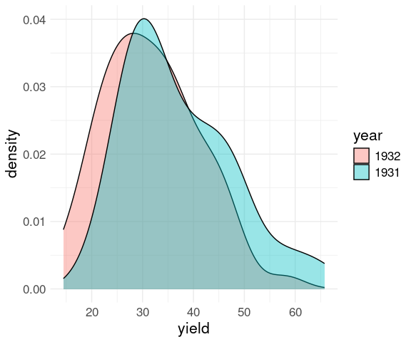 Mapping the fill aesthetic to year allows the separate densities to be identified: