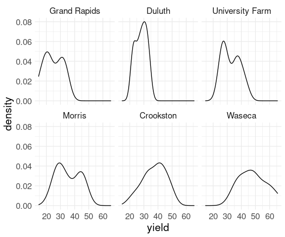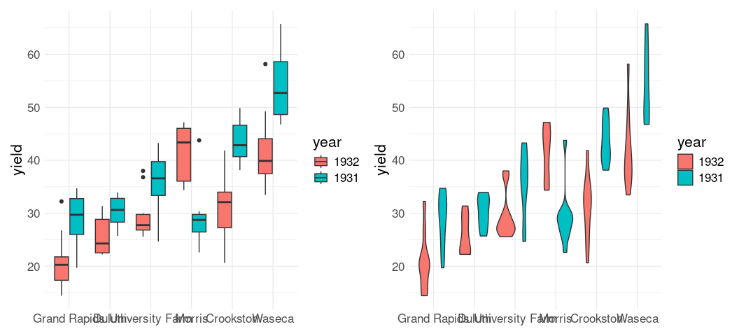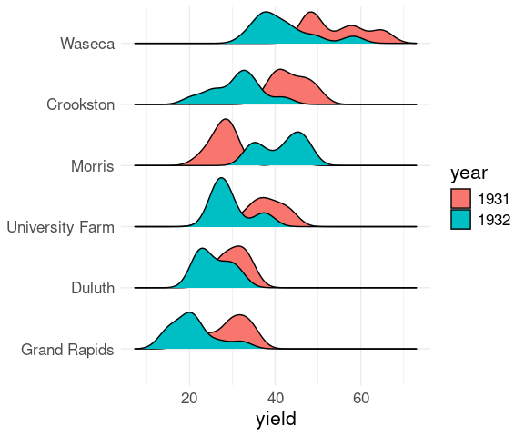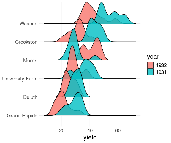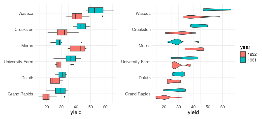 ggplot(mutate(barley, year = reorder(year, -yield))) +