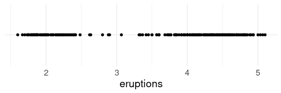 For the eruption durations in the faithful data a strip plot shows the two modes around 2 and 4 minutes: