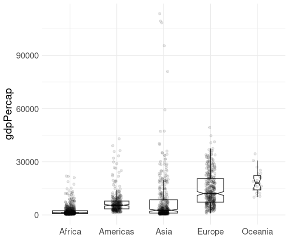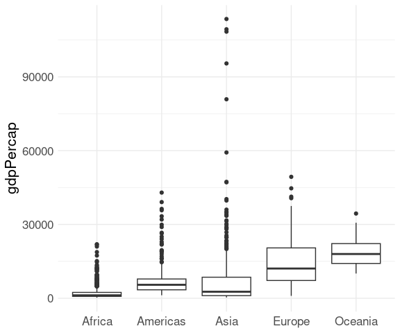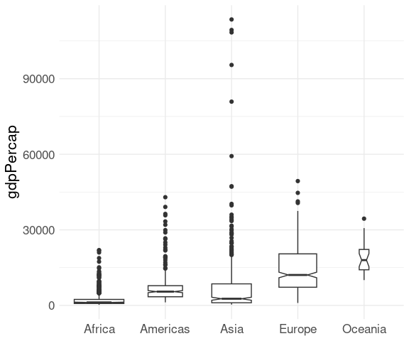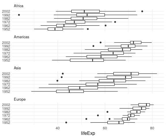 p <- ggplot(gapminder, aes(y = continent, x = lifeExp))