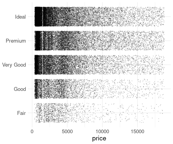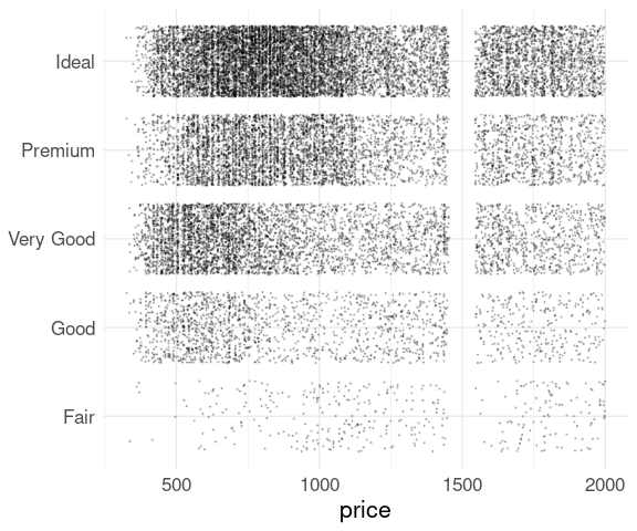 A simple strip plot of price within the different cut levels in the diamonds data is not very helpful:
