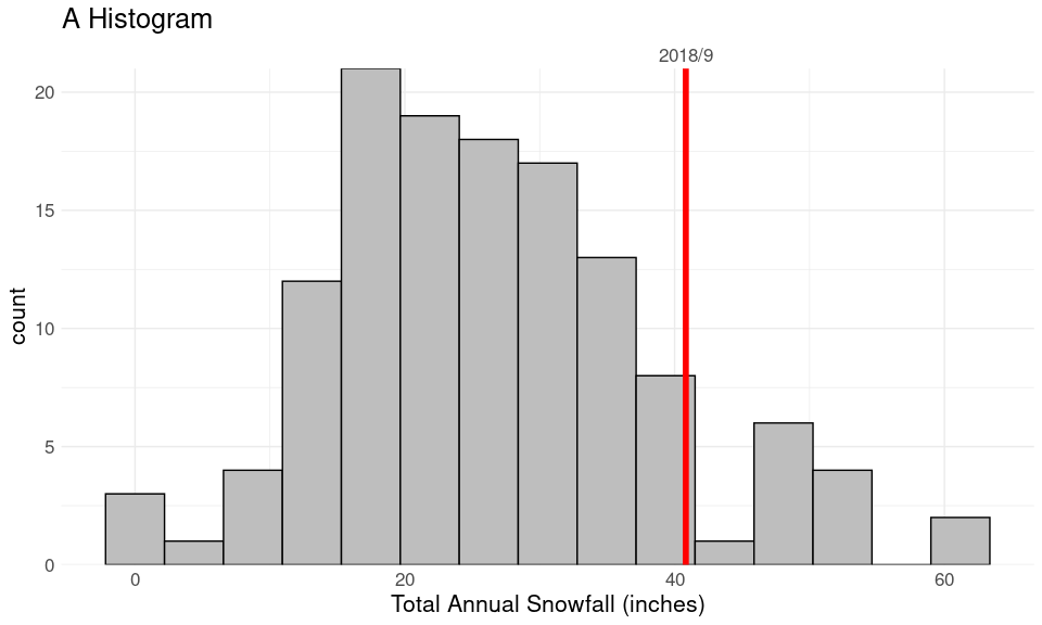 geom_histogram(aes(x = snow), bins = 15, fill = "grey", color = "black") +