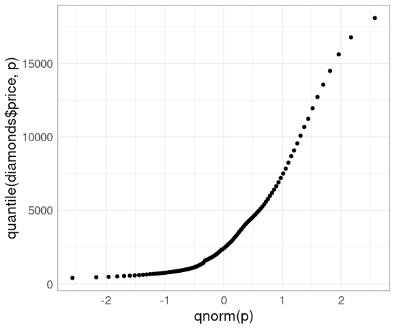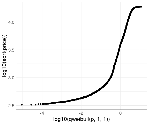 geom_point(aes(x = log10(qweibull(p, 1, 1)), y = log10(sort(price)))) +