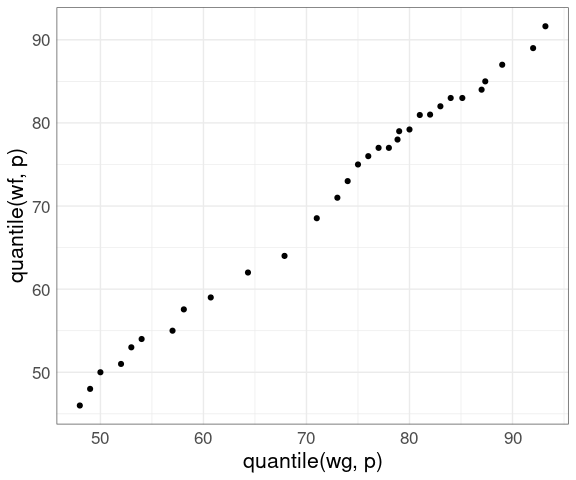 geom_point(aes(x = quantile(wg, p), y = quantile(wf, p))) +