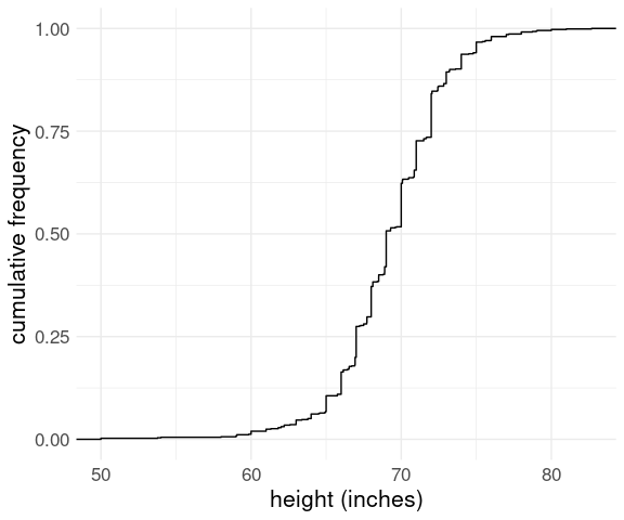 The data set heights in package dslabs contains self-reported heights for a number of female and male students. The plot below shows the empirical CDF for male heights: