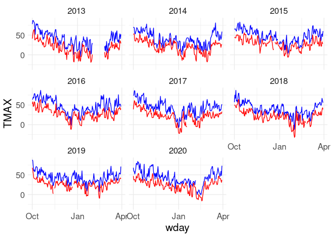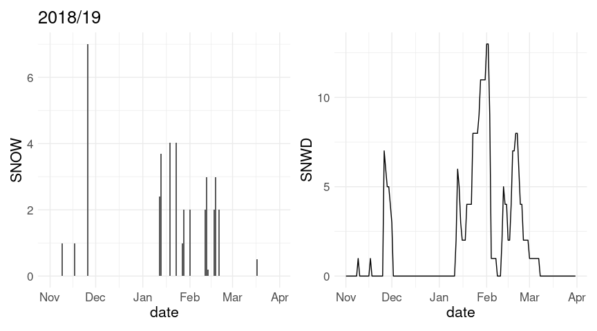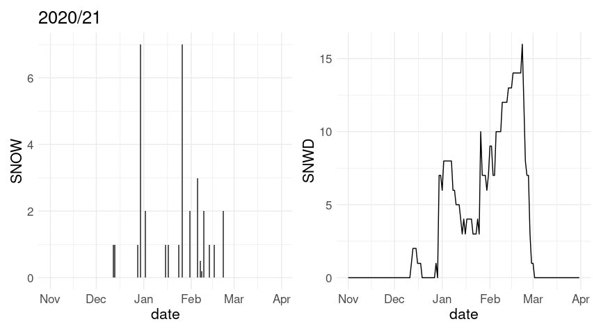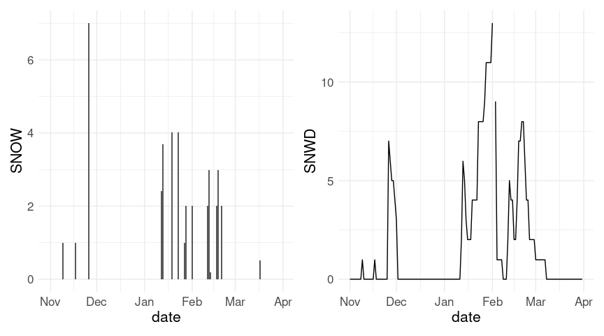 LS0tCnRpdGxlOiAiU25vd2ZhbGwgaW4gSW93YSBDaXR5IgpvdXRwdXQ6CiAgaHRtbF9kb2N1bWVudDoKICAgIHRvYzogeWVzCiAgICBjb2RlX2Rvd25sb2FkOiB0cnVlCiAgICBjb2RlX2ZvbGRpbmc6ICJzaG93IgotLS0KCkFkYXB0ZWQgZnJvbSBhIFtibG9nCnBvc3RdKGh0dHBzOi8vc2N0eW5lci5naXRodWIuaW8vcmVkb2luZy1ncmFwaHMuaHRtbCkgYnkgW1NhbQpUeW5lcl0oaHR0cHM6Ly9zY3R5bmVyLmdpdGh1Yi5pbykKCmBgYHtyIGdsb2JhbF9vcHRpb25zLCBpbmNsdWRlID0gRkFMU0V9CmtuaXRyOjpvcHRzX2NodW5rJHNldChjb2xsYXBzZSA9IFRSVUUsIGZpZy5hbGlnbiA9ICJjZW50ZXIiKQpgYGAKCmBgYHtyLCBtZXNzYWdlID0gRkFMU0V9CmxpYnJhcnkoZHBseXIpCmxpYnJhcnkodGlkeXIpCiMjbGlicmFyeShybm9hYSkKbGlicmFyeShnZ3Bsb3QyKQpsaWJyYXJ5KGdncmVwZWwpCmxpYnJhcnkocGF0Y2h3b3JrKQp0aGVtZV9zZXQodGhlbWVfbWluaW1hbCgpICsgdGhlbWUodGV4dCA9IGVsZW1lbnRfdGV4dChzaXplID0gMTYpKSkKYGBgCgojIyBHZXR0aW5nIHRoZSBEYXRhIGZyb20gTk9BQQoKQ2xpbWF0ZSBkYXRhIGlzIGF2YWlsYWJsZSB2aWEgYSBbd2ViIHNlcnZpY2UKQVBJXShodHRwczovL3d3dy5uY2RjLm5vYWEuZ292L2Nkby13ZWIvd2Vic2VydmljZXMvdjIpIGZyb20KW05PQUFdKGh0dHBzOi8vd3d3Lm5vYWEuZ292LykuCgpUaGUKW2Bybm9hYWBdKGh0dHBzOi8vY3Jhbi5yLXByb2plY3Qub3JnL3BhY2thZ2U9cm5vYWEpCnBhY2thZ2UgcHJvdmlkZXMgYW4gaW50ZXJmYWNlIHRvIHRoaXMgQVBJLiAgQQpbdHV0b3JpYWxdKGh0dHBzOi8vZG9jcy5yb3BlbnNjaS5vcmcvcm5vYWEvYXJ0aWNsZXMvcm5vYWEuaHRtbCkgaXMKYXZhaWxhYmxlIGZyb20gW3JPcGVuU2NpXShodHRwczovL3JvcGVuc2NpLm9yZykuCgpUaGlzIGNvZGUgd291bGQgYmUgdXNlZCB0byBmaW5kIHRoZSBtb3N0IHN1aXRhYmxlIElvd2EgQ2l0eSBzdGF0aW9uOgoKYGBge3IsIGV2YWwgPSBGQUxTRX0Kb3B0aW9ucygiPGtleT4iKSAjIyBtYXkgbm90IGJlIG5lZWRlZApzdGF0IDwtIGdoY25kX3N0YXRpb25zKCkKaWNfc3RhdCA8LSBmaWx0ZXIoc3RhdCwgZ3JlcGwoIklPV0EgQ0lUWSIsIG5hbWUpICYgZWxlbWVudCA9PSAiU05PVyIpCnNlbGVjdChpY19zdGF0LCBuYW1lLCBpZCwgZW5kc193aXRoKCJ5ZWFyIikpCmBgYAoKVGhlIGJlc3Qgc3RhdGlvbiBzZWVtcyB0byBiZQoKYGBge3J9CmljX2lkIDwtICJVU0MwMDEzNDEwMSIKYGBgCgpUaGUgY3VycmVudCBkYXRhIGZvciB0aGlzIHN0YXRpb24gY2FuIHRoZW4gYmUgb2J0YWluZWQgZnJvbSBOT0FBOgoKYGBge3IsIGV2YWwgPSBGQUxTRX0KaWNfZGF0YV9yYXcgPC0gZ2hjbmQoaWNfaWQsIHJlZnJlc2ggPSBUUlVFKQojIyBnb2VzIGludG8gYSBjYWNoZSBmaWxlIGFzIGNzdgojIyAvaG9tZS9sdWtlLy5jYWNoZS9ybm9hYS9naGNuZC9VU0MwMDEzNDEwMS5kbHkKd3JpdGUuY3N2KGljX2RhdGFfcmF3LCByb3cubmFtZXMgPSBGQUxTRSwgZmlsZSA9ICJpY19ub2FhLmNzdiIpCiMjIGd6aXAgYW5kIG1vdmUgdG8gZGF0YSBkaXJlY3RvcnkKYGBgCgpJIGhhdmUgZG9uZSB0aGVzZSBzdGVwcyBhbmQgc3RvcmVkIHRoZSBkYXRhIGxvY2FsbHk7IEkgd2lsbCB1cGRhdGUKdGhlIGRhdGEgYXMgdGhlIGNvdXJzZSBwcm9ncmVzc2VzLgoKRG93bmxvYWQgdGhlIGxvY2FsIGRhdGEgY29weToKCmBgYHtyfQppZiAoISBmaWxlLmV4aXN0cygiaWNfbm9hYS5jc3YuZ3oiKSkKICAgIGRvd25sb2FkLmZpbGUoImh0dHA6Ly93d3cuc3RhdC51aW93YS5lZHUvfmx1a2UvZGF0YS9pY19ub2FhLmNzdi5neiIsCiAgICAgICAgICAgICAgICAgICJpY19ub2FhLmNzdi5neiIpCiMjIG1ha2Ugc3VyZSBkYXRhIGlzIHVwIHRvIGRhdGUKaWNfZGF0YV9yYXcgPC0gYXNfdGliYmxlKHJlYWQuY3N2KCJpY19ub2FhLmNzdi5neiIsIGhlYWQgPSBUUlVFKSkKYGBgCgoKIyMgUHJvY2Vzc2luZyB0aGUgRGF0YQoKVGhlIHJhdyBkYXRhOgoKYGBge3J9CmljX2RhdGFfcmF3CmBgYAoKVGhlIGRvY3VtZW50YXRpb24gZm9yIHRoZSBkYXRhIGlzIGF2YWlsYWJsZSBhdAoKPiBodHRwczovL3d3dzEubmNkYy5ub2FhLmdvdi9wdWIvZGF0YS9naGNuL2RhaWx5L3JlYWRtZS50eHQKClRoZSBhdmFpbGFibGUgX2VsZW1lbnRzXywgb3IgbWVhc3VyZW1lbnRzLCBhcmU6CgpgYGB7cn0KdW5pcXVlKGljX2RhdGFfcmF3JGVsZW1lbnQpCmBgYAoKVGhlIHByaW1hcnkgb25lcyBhcmU6CgpgYGAKUFJDUCA9IFByZWNpcGl0YXRpb24gKHRlbnRocyBvZiBtbSkKU05PVyA9IFNub3dmYWxsIChtbSkKU05XRCA9IFNub3cgZGVwdGggKG1tKQpUTUFYID0gTWF4aW11bSB0ZW1wZXJhdHVyZSAodGVudGhzIG9mIGRlZ3JlZXMgQykKVE1JTiA9IE1pbmltdW0gdGVtcGVyYXR1cmUgKHRlbnRocyBvZiBkZWdyZWVzIEMpCmBgYAoKVGhlIHZhbHVlcyBmb3IgZGF5ICRrJCBhcmUgc3RvcmVkIGluIHRoZSB2YXJpYWJsZSBgVkFMVUVgJGskLiBBIHNlbGVjdGlvbjoKCmBgYHtyfQppY19mZWIyMDE5IDwtIGZpbHRlcihpY19kYXRhX3JhdywgeWVhciA9PSAyMDE5LCBtb250aCA9PSAyKQpzZWxlY3QoaWNfZmViMjAxOSwgZWxlbWVudCwgVkFMVUUxLCBWQUxVRTI4LCBWQUxVRTMxKQpgYGAKCldlIG5lZWQgdG86CgotIFJlc2hhcGUgdGhlIGRhdGEuCi0gRGVhbCB3aXRoIHRoZSBib2d1cyBkYXlzLgoKU3RhcnQgYnkgc2VsZWN0aW5nIHRoZSBjb2x1bW5zIHdlIG5lZWQ6CgpgYGB7cn0KaWNfZGF0YSA8LSBzZWxlY3QoaWNfZGF0YV9yYXcsIHllYXIsIG1vbnRoLCBlbGVtZW50LCBzdGFydHNfd2l0aCgiVkFMVUUiKSkKaWNfZGF0YQpgYGAKClJlc2hhcGUgZnJvbSAodmVyeSkgd2lkZSB0byAodG9vKSBsb25nOgpgYGB7cn0KaWNfZGF0YSA8LSBwaXZvdF9sb25nZXIoaWNfZGF0YSwgVkFMVUUxIDogVkFMVUUzMSwKICAgICAgICAgICAgICAgICAgICAgICAgbmFtZXNfdG8gPSAiZGF5IiwgdmFsdWVzX3RvID0gInZhbHVlIikKaWNfZGF0YQpgYGAKCkV4dHJhY3QgdGhlIGRheSBhcyBhIG51bWJlcjoKCmBgYHtyfQppY19kYXRhIDwtIG11dGF0ZShpY19kYXRhLCBkYXkgPSByZWFkcjo6cGFyc2VfbnVtYmVyKGRheSkpCmljX2RhdGEKYGBgCgpSZXNoYXBlIGZyb20gdG9vIGxvbmcgdG8gdGlkeSB3aXRoIG9uZSByb3cgcGVyIGRheSwga2VlcGluZyBvbmx5IHRoZQpwcmltYXJ5IHZhcmlhYmxlczoKCmBgYHtyfQpjb3JldmFycyA8LSBjKCJUTUFYIiwgIlRNSU4iLCAiUFJDUCIsICJTTk9XIiwgIlNOV0QiKQppY19kYXRhIDwtIGZpbHRlcihpY19kYXRhLCBlbGVtZW50ICVpbiUgY29yZXZhcnMpCmljX2RhdGEgPC0gcGl2b3Rfd2lkZXIoaWNfZGF0YSwgbmFtZXNfZnJvbSA9ICJlbGVtZW50IiwgdmFsdWVzX2Zyb20gPSAidmFsdWUiKQppY19kYXRhCmBgYAoKQWRkIGEgYGRhdGVgIHZhcmlhYmxlIGZvciBwbG90dGluZyBhbmQgdG8gaGVscCBnZXQgcmlkIG9mIGJvZ3VzIGRheXM6CgpgYGB7cn0KaWNfZGF0YSA8LSBtdXRhdGUoaWNfZGF0YSwgZGF0ZSA9IGx1YnJpZGF0ZTo6bWFrZV9kYXRlKHllYXIsIG1vbnRoLCBkYXkpKQpmaWx0ZXIoaWNfZGF0YSwgeWVhciA9PSAyMDE5LCBtb250aCA9PSAyLCBkYXkgPj0gMjcpCmBgYAoKR2V0IHJpZCBvZiB0aGUgYm9ndXMgZGF5czoKYGBge3J9CmljX2RhdGEgPC0gZmlsdGVyKGljX2RhdGEsICEgaXMubmEoZGF0ZSkpCmBgYAoKTWFrZSB1bml0cyBtb3JlIHN0YW5kYXJkIChBbWVyaWNhbik6CgpgYGB7cn0KbW0yaW4gPC0gZnVuY3Rpb24oeCkgeCAvIDI1LjQKQzJGIDwtIGZ1bmN0aW9uKHgpIDMyICsgMS44ICogeAppY19kYXRhIDwtIHRyYW5zbXV0ZShpY19kYXRhLCB5ZWFyLCBtb250aCwgZGF5LCBkYXRlLAogICAgICAgICAgICAgICAgICAgICBQUkNQID0gbW0yaW4oUFJDUCAvIDEwKSwKICAgICAgICAgICAgICAgICAgICAgU05PVyA9IG1tMmluKFNOT1cpLAogICAgICAgICAgICAgICAgICAgICBTTldEID0gbW0yaW4oU05XRCksCiAgICAgICAgICAgICAgICAgICAgIFRNSU4gPSBDMkYoVE1JTiAvIDEwKSwKICAgICAgICAgICAgICAgICAgICAgVE1BWCA9IEMyRihUTUFYIC8gMTApKQpgYGAKCgojIyBUaGUgV2ludGVycyBvZiAyMDE4LzIwMTkgYW5kIDIwMjAvMjAyMQoKIyMjIERhaWx5IFNub3dmYWxsCgpFeHRyYWN0IHRoZSBkYXRhIGZvciBkYXlzIGJldHdlZW4gTm92ZW1iZXIgMSBhbmQgTWFyY2ggMzE6CgpgYGB7cn0KdzE4IDwtIGZpbHRlcihpY19kYXRhLCBkYXRlID49ICIyMDE4LTExLTAxIiAmIGRhdGUgPD0gIjIwMTktMDMtMzEiKQp3MjAgPC0gZmlsdGVyKGljX2RhdGEsIGRhdGUgPj0gIjIwMjAtMTEtMDEiICYgZGF0ZSA8PSAiMjAyMS0wMy0zMSIpCmBgYAoKQSBmaXJzdCBzZXQgb2YgcGxvdHM6CgpgYGB7ciwgZmlnLndpZHRoID0gOX0KcDEgPC0gZ2dwbG90KHcxOCwgYWVzKHggPSBkYXRlKSkgKyBnZW9tX2NvbChhZXMoeSA9IFNOT1cpKQpwMiA8LSBnZ3Bsb3QodzE4LCBhZXMoeCA9
