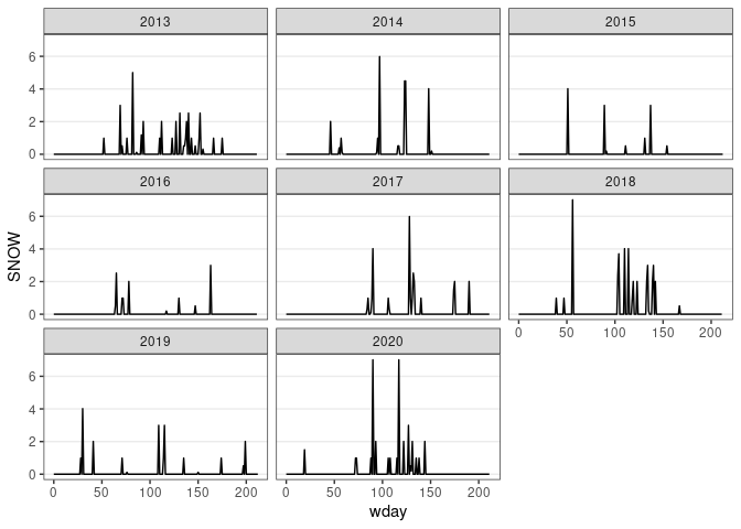 ggplot(d13) + geom_line(aes(x = wday, y = SNOW)) + facet_wrap(~ wyear) + thm