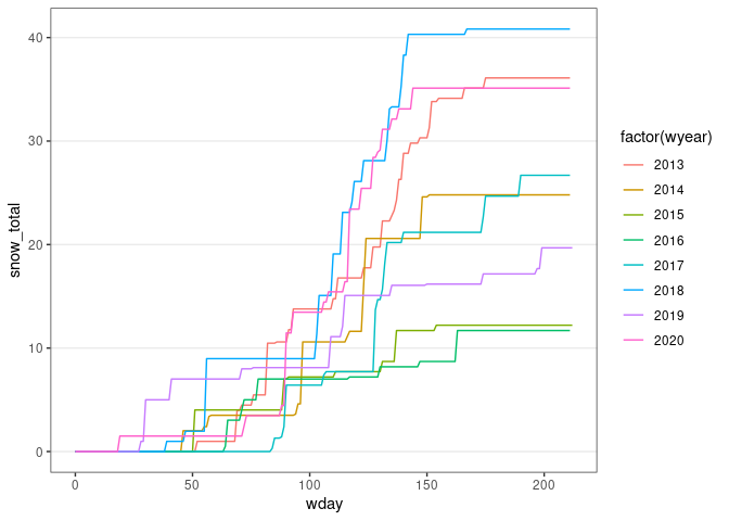 geom_line(aes(x = wday, y = snow_total, color = factor(wyear))) + thm