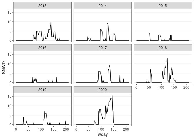 ggplot(d13) + geom_line(aes(x = wday, y = SNWD)) + facet_wrap(~ wyear) + thm