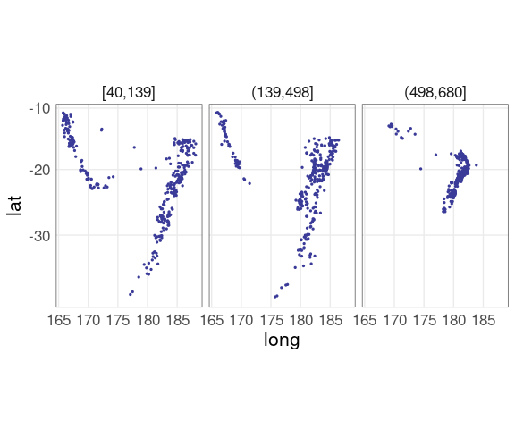 For the quakes data, breaking the depth values into thirds gives some insights: