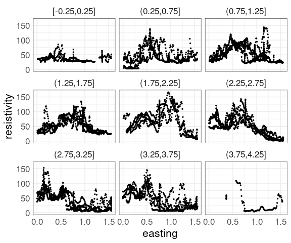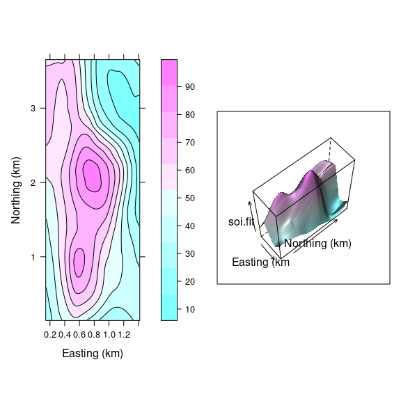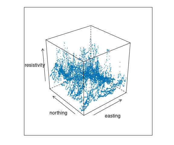 Data from Cleveland’s Visualizing Data book contains measurements of soil resistivity of an agricultural field along a roughly rectangular grid.