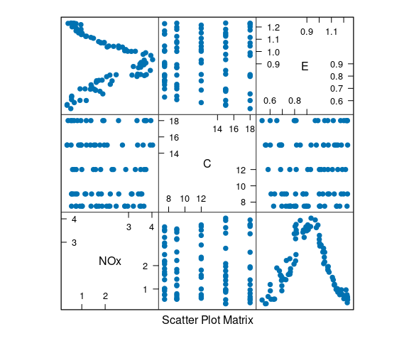 The ethanol data frame in the lattice package contains data from an experiment on efficiency and emissions in small one-cylinder engines.
