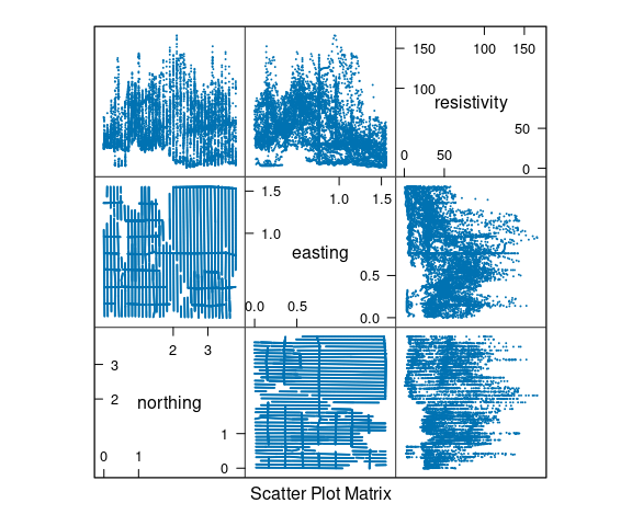 A scatterplot matrix of the resistivity, northing and easting variables: