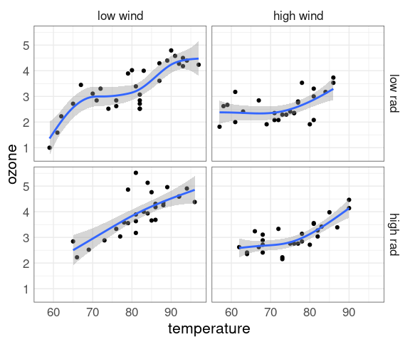 LS0tCnRpdGxlOiAiVmlzdWFsaXppbmcgVGhyZWUgb3IgTW9yZSBOdW1lcmljIFZhcmlhYmxlcyIKb3V0cHV0OgogIGh0bWxfZG9jdW1lbnQ6CiAgICB0b2M6IHllcwogICAgY29kZV9mb2xkaW5nOiBzaG93CiAgICBjb2RlX2Rvd25sb2FkOiB0cnVlCi0tLQoKPGxpbmsgcmVsPSJzdHlsZXNoZWV0IiBocmVmPSJzdGF0NDU4MC5jc3MiIHR5cGU9InRleHQvY3NzIiAvPgo8c3R5bGUgdHlwZT0idGV4dC9jc3MiPiAucmVtYXJrLWNvZGUgeyBmb250LXNpemU6IDg1JTsgfSA8L3N0eWxlPgo8IS0tIHRpdGxlIGJhc2VkIG9uIFdpbGtlJ3MgY2hhcHRlciAtLT4KCmBgYHtyIHNldHVwLCBpbmNsdWRlID0gRkFMU0UsIG1lc3NhZ2UgPSBGQUxTRX0Kc291cmNlKGhlcmU6OmhlcmUoInNldHVwLlIiKSkKa25pdHI6Om9wdHNfY2h1bmskc2V0KGNvbGxhcHNlID0gVFJVRSwgbWVzc2FnZSA9IEZBTFNFLAogICAgICAgICAgICAgICAgICAgICAgZmlnLmhlaWdodCA9IDUsIGZpZy53aWR0aCA9IDYsIGZpZy5hbGlnbiA9ICJjZW50ZXIiKQoKc2V0LnNlZWQoMTIzNDUpCmxpYnJhcnkoZHBseXIpCmxpYnJhcnkodGlkeXIpCmxpYnJhcnkoZ2dwbG90MikKbGlicmFyeShsYXR0aWNlKQpsaWJyYXJ5KGdyaWRFeHRyYSkKbGlicmFyeShwYXRjaHdvcmspCnNvdXJjZShoZXJlOjpoZXJlKCJkYXRhc2V0cy5SIikpCnRoZW1lX3NldCh0aGVtZV9taW5pbWFsKCkgKwogICAgICAgICAgdGhlbWUodGV4dCA9IGVsZW1lbnRfdGV4dChzaXplID0gMTYpLAogICAgICAgICAgICAgICAgcGFuZWwuYm9yZGVyID0gZWxlbWVudF9yZWN0KGNvbG9yID0gImdyZXkzMCIsIGZpbGwgPSBOQSkpKQpgYGAKCgojIyBNb3ZpbmcgQmV5b25kIFR3byBEaW1lbnNpb25zCgpQYXBlciBhbmQgc2NyZWVucyBhcmUgdHdvLWRpbWVuc2lvbmFsLgoKV2UgbGl2ZSBpbiBhIHRocmVlLWRpbWVuc2lvbmFsIHdvcmxkLgoKRm9yIHZpc3VhbGl6aW5nIHRocmVlLWRpbWVuc2lvbmFsIGRhdGEgd2UgY2FuIHRha2UgYWR2YW50YWdlIG9mIG91cgp2aXN1YWwgc3lzdGVtJ3MgYWJpbGl0eSB0byByZWNvbnN0cnVjdCB0aHJlZS1kaW1lbnNpb25hbCBzY2VuZXMgZnJvbQp0d28tZGltZW5zaW9uYWwgaW1hZ2VzIHVzaW5nOgoKKiBwZXJzcGVjdGl2ZSByZW5kZXJpbmcsIGxpZ2h0aW5nLCBhbmQgc2hhZGluZzsKCiogbW90aW9uIHdpdGggYW5pbWF0aW9uIGFuZCBpbnRlcmFjdGlvbjsKCiogc3RlcmVvIHZpZXdpbmcgbWV0aG9kcy4KCk1vc3Qgb2YgdXMgaGF2ZSBubyBpbnR1aXRpb24gZm9yIGZvdXIgYW5kIG1vcmUgZGltZW5zaW9ucy4KClNvbWUgdGVjaG5pcXVlcyB0aGF0IHdvcmsgaW4gdGhyZWUgZGltZW5zaW9ucyBidXQgY2FuIGFsc28gYmUgdXNlZCBpbgpoaWdoZXIgZGltZW5zaW9uczoKCiogX0dyb3VwaW5nXyBieSBlbmNvZGluZyBhZGRpdGlvbmFsIHZhcmlhYmxlcyBpbiBjb2xvciBvciBzaGFwZSBjaGFubmVscy4KCiogX0NvbmRpdGlvbmluZ18gYnkgdXNpbmcgc21hbGwgbXVsdGlwbGVzIGZvciBkaWZmZXJlbnQgbGV2ZWxzIG9mCiAgYWRkaXRpb25hbCB2YXJpYWJsZXMuCgpIaWdoZXIgZGltZW5zaW9ucyBtYXliZSB1cCB0byB0ZW47IHRoZSBbX2N1cnNlIG9mCmRpbWVuc2lvbmFsaXR5X10oaHR0cHM6Ly9lbi53aWtpcGVkaWEub3JnL3dpa2kvQ3Vyc2Vfb2ZfZGltZW5zaW9uYWxpdHkpCmlzIGEgbGltaXRpbmcgZmFjdG9yLgoKVGhlIGBsYXR0aWNlYCBwYWNrYWdlIHByb3ZpZGVzIHNvbWUgZmFjaWxpdGllcyBub3QgZWFzaWx5IGF2YWlsYWJsZSBpbgpgZ2dwbG90YCBzbyBJIHdpbGwgdXNlIGBsYXR0aWNlYCBpbiBhIGZldyBleGFtcGxlcy4KCgojIyBTY2F0dGVycGxvdCBNYXRyaWNlcwoKQSBfc2NhdHRlcnBsb3QgbWF0cml4XyBpcyBhIHVzZWZ1bCBvdmVydmlldyB0aGF0IHNob3dzIGFsbCBwYWlyd2lzZQpzY2F0dGVycGxvdHMuCgpUaGVyZSBhcmUgbWFueSBvcHRpb25zIGZvciBjcmVhdGluZyBzY2F0dGVycGxvdCBtYXRyaWNlcyBpbiBSOyBhIGZldyBhcmU6CgoqIGBwYWlyc2AgaW4gYmFzZSBncmFwaGljczsKCiogYHNwbG9tYCBpbiBwYWNrYWdlIGBsYXR0aWNlYAoKKiBgZ2dwYWlyc2AgaW4gYEdHYWxseWAuCgpTb21lIGV4YW1wbGVzIHVzaW5nIHRoZSBgbXBnYCBkYXRhOgoKYGBge3IsIGNsYXNzLnNvdXJjZSA9ICJmb2xkLWhpZGUifQpsaWJyYXJ5KGxhdHRpY2UpCnNwbG9tKHNlbGVjdChtcGcsIGN0eSwgaHd5LCBkaXNwbCksCiAgICAgIGNleCA9IDAuNSwgcGNoID0gMTkpCmBgYAoKYGBge3IsIGNsYXNzLnNvdXJjZSA9ICJmb2xkLWhpZGUifQpsaWJyYXJ5KEdHYWxseSkKZ2dwYWlycyhzZWxlY3QobXBnLCBjdHksIGh3eSwgZGlzcGwpLAogICAgICAgIGxvd2VyID0gbGlzdChjb250aW51b3VzID0KICAgICAgICAgICAgICAgICAgICAgICAgIHdyYXAoInBvaW50cyIsCiAgICAgICAgICAgICAgICAgICAgICAgICAgICAgIHNpemUgPSAxKSkpCmBgYAoKU29tZSB2YXJpYXRpb25zOgoKKiBkaWFnb25hbCBsZWZ0LXRvcCB0byByaWdodC1ib3R0b20gb3IgbGVmdC1ib3R0b20gdG8gcmlnaHQtdG9wOwoKKiBob3cgdG8gdXNlIHRoZSBwYW5lbHMgaW4gdGhlIHR3byB0cmlhbmdsZXM7CgoqIGhvdyB0byB1c2UgdGhlIHBhbmVscyBvbiB0aGUgZGlhZ29uYWwuCgpTb21lIHRoaW5ncyB0byBsb29rIGZvciBpbiB0aGUgcGFuZWxzOgoKKiBjbHVzdGVycyBvciBzZXBhcmF0aW9uIG9mIGdyb3VwczsKCiogc3Ryb25nIHJlbGF0aW9uc2hpcHM7CgoqIG91dGxpZXJzLCByb3VuZGluZywgY2x1bXBpbmcuCgpOb3RlczoKCiogU2NhdHRlcnBsb3QgbWF0cmljZXMgd2VyZSBwb3B1bGFyaXplZCBieSBDbGV2ZWxhbmQgYW5kIGNvLXdvcmtlcnMgYXQKICBCZWxsIExhYm9yYXRvcmllcyBpbiB0aGUgMTk4MHMuCgoqIENsZXZlbGFuZCByZWNvbW1lbmRzIHVzaW5nIHRoZSBmdWxsIHZlcnNpb24gZGlzcGxheWluZyBib3RoIHRyaWFuZ2xlcyBvZgogIHBsb3RzIHRvIGZhY2lsaXRhdGUgX3Zpc3VhbCBsaW5raW5nXy4KCiogSWYgeW91IGRvIHVzZSBvbmx5IG9uZSB0cmlhbmdsZSwgYW5kIG9uZSB2YXJpYWJsZSBpcyBhIHJlc3BvbnNlLAogIHRoZW4gaXQgaXMgYSBnb29kIGlkZWEgdG8gYXJyYW5nZSBmb3IgdGhhdCB2YXJpYWJsZSB0byBiZSBzaG93biBvbgogIHRoZSB2ZXJ0aWNhbCBheGlzIGFnYWluc3QgYWxsIG90aGVyIHZhcmlhYmxlcy4KCiogVGhlIHN5bW1ldHJ5IGluIHRoZSBwbG90IHdpdGggdGhlIGRpYWdvbmFsIHJ1bm5pbmcgZnJvbSBib3R0b20tbGVmdAogIHRvIHRvcC10aWdodCBhcyBwcm9kdWNlZCBieSBgc3Bsb21gIGlzIHNpbXBsZXIgdGhhbiB0aGUgc3ltbWV0cnkgaW4KICB0aGUgcGxvdCB3aXRoIHRoZSBkaWFnb25hbCBydW5uaW5nIGZyb20gdG9wLWxlZnQgdCBib3R0b20tcmlnaHQKICBwcm9kdWNlZCBieSBgcGFpcnNgIGFuZCBgZ2dwYWlyc2AuCgoKIyMgVGhyZWUgRGF0YSBTZXRzCgpUaGVlIHVzZWZ1bCBkYXRhIHNldHMgdG8gZXhwbG9yZToKCiogVGhlIGBldGhhbm9sYCBkYXRhIGZyYW1lIGluIHRoZSBgbGF0dGljZWAgcGFja2FnZS4KCiogU29pbCByZXNpc3Rpdml0eSBkYXRhIGZyb20gZnJvbSBDbGV2ZWxhbmQncyBfVmlzdWFsaXppbmcgRGF0YV8gYm9vay4KCiogVGhlIGBxdWFrZXNgIGRhdGEgZnJhbWUgaW4gdGhlIGBkYXRhc2V0c2AgcGFja2FnZS4KCgojIyMgRXRoYW5vbCBEYXRhCgpUaGUgYGV0aGFub2xgIGRhdGEgZnJhbWUgaW4gdGhlIGBsYXR0aWNlYCBwYWNrYWdlIGNvbnRhaW5zIGRhdGEgZnJvbQphbiBleHBlcmltZW50IG9uIGVmZmljaWVuY3kgYW5kIGVtaXNzaW9ucyBpbiBzbWFsbCBvbmUtY3lsaW5kZXIKZW5naW5lcy4KClRoZSBkYXRhIGZyYW1lIGNvbnRhaW5zIDg4IG9ic2VydmF0aW9ucyBvbiB0aHJlZSB2YXJpYWJsZXM6CgoqIGBOT3hgOiBDb25jZW50cmF0aW9uIG9mIG5pdHJvZ2VuIG94aWRlcyAoTk8gYW5kIE5PMikgaW4gbWljcm9ncmFtcy4KCiogYENgIENvbXByZXNzaW9uIHJhdGlvIG9mIHRoZSBlbmdpbmUuCgoqIGBFYCBFcXVpdmFsZW5jZSByYXRpbywgYSBtZWFzdXJlIG9mIHRoZSByaWNobmVzcyBvZiB0aGUgYWlyIGFuZAogIGV0aGFub2wgZnVlbCBtaXh0dXJlLgoKQSBzY2F0dGVycGxvdCBtYXRyaXg6CgpgYGB7ciwgY2xhc3Muc291cmNlID0gImZvbGQtaGlkZSJ9CmxpYnJhcnkobGF0dGljZSkKc3Bsb20oZXRoYW5vbCwgY2VkID0gMC41LCBwY2ggPSAxOSkKYGBgCgpBIGdvYWwgaXMgdG8gdW5kZXJzdGFuZCB0aGUgcmVsYXRpb25zaGlwIGJldHdlZW4gdGhlIHBvbGx1dGFudCBgTk94YCBhbmQgdGhlCmNvbnRyb2xsYWJsZSB2YXJpYWJsZXMgYEVgIGFuZCBgQ2AuCgoKIyMjIFNvaWwgUmVzaXN0aXZpdHkgRGF0YQoKW0RhdGFdKGh0dHBzOi8vc3RhdC51aW93YS5lZHUvfmx1a2UvZGF0YS9zb2lsLmRhdCkgZnJvbSBDbGV2ZWxhbmQncwpfVmlzdWFsaXppbmcgRGF0YV8gYm9vayBjb250YWlucyBtZWFzdXJlbWVudHMgb2Ygc29pbCByZXNpc3Rpdml0eSBvZgphbiBhZ3JpY3VsdHVyYWwgZmllbGQg