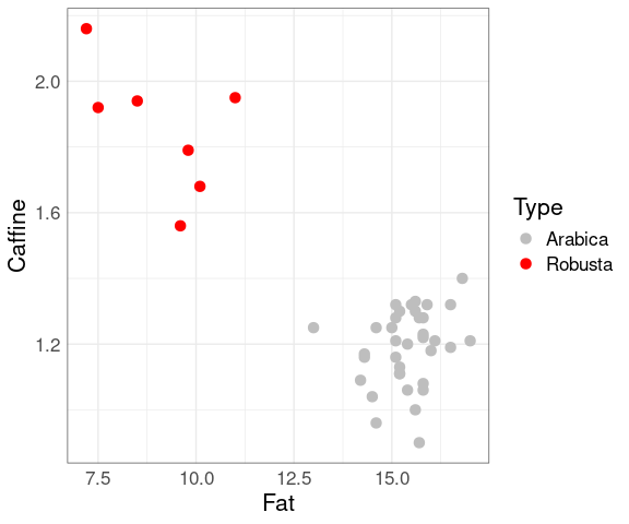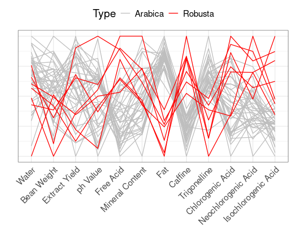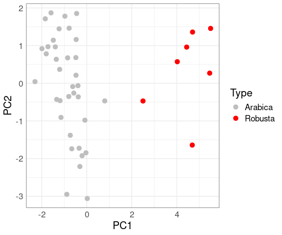For the coffee data the first principal component also separates the varieties well:
