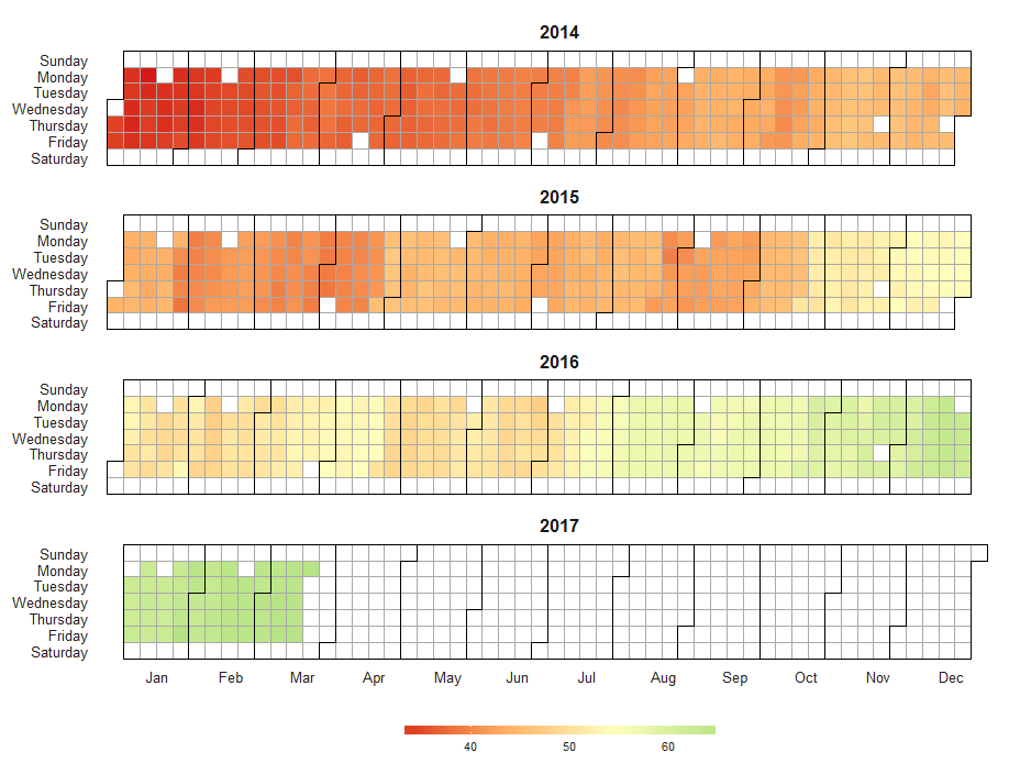 This layout with days on the vertical axis works well with a single row, which could be extended to a multi-year plot: