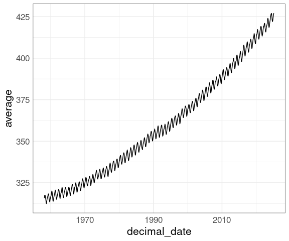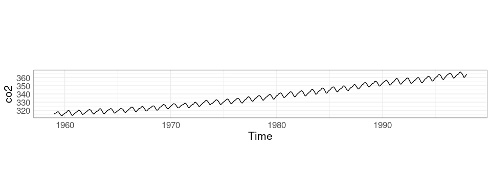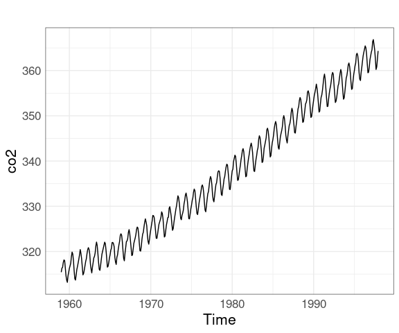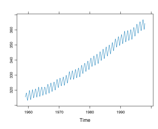 The co2 data set in the datasets package contains monthly concentrations of CO2 for the years 1959 to 1997 recorded at the Mauna Loa observatory.