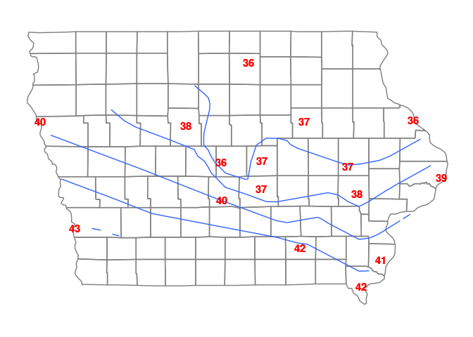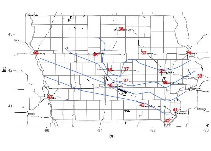 ggmap(map) + borders("county", "iowa") + tconts + tpoints