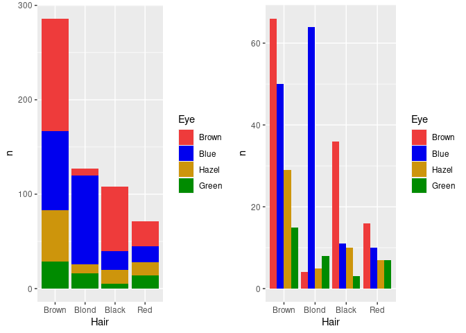 geom_col(aes(x = Hair, y = n, fill = Eye)) +